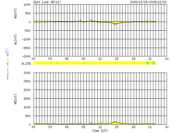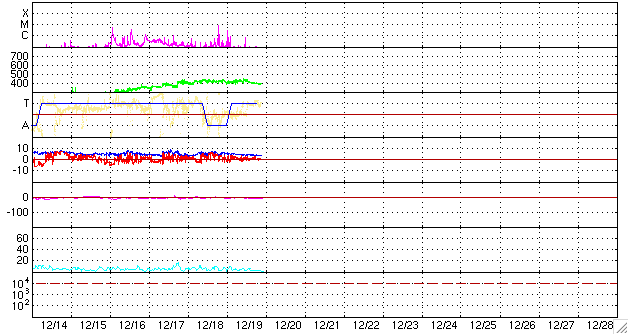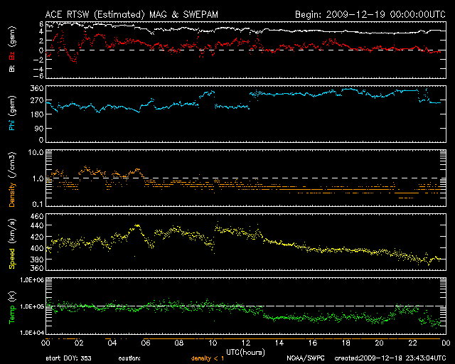2009/12/20 08:43 更新 CMEの到来はまだです。太陽では、1036、1037黒点群が出現したそうです。 担当 篠原 CMEによる太陽風の変化は、まだやって来ていません。 太陽風は、速度が420km/秒から380km/秒へゆっくりと低下し、 磁場強度も4nTとやや弱まった状態で安定しています。 CMEの発生位置から考えて、到来は間違いないと思いますが、 フレアの規模が小さかったことから、噴出した速度は比較的遅かったのではないかと思います。 そうすると、地球まで4日くらいかかるとすると、今日あたりの到着となるのかもしれません。 到来が遅れるほど、速度の上昇は小さいとも言えるため、 オーロラ活動など磁気圏への影響も小さくなってきます。 引き続き、ACEのデータに注目して下さい。 太陽では、1036、1037と2つの黒点群が一気に出現したそうです。 SOHOの写真が昨日のお昼くらいから更新されていないため、 写真で確認することはできないのですが、 南半球のやや西側(右側)に、1036群、 北半球の東側(左側)半分ほどに、1037群となっています。 1036群は、EIT195でもまだ見えていません。 1037群は、EIT195で東端付近に明るく見えている場所ではないかと思います。 3黒点群が同時に現れている様子を、早く見たいものです。 もうしばらくすると、ぐんま天文台の太陽画像で見つけることができるかもしれません (記事の時点では、まだ更新が始まっていませんでした)。 1035黒点群は、いよいよ活動度が下がって来た様です。 昨日は、Bクラスの変化が見られた程度です。 X線の強度自体も低下の傾向が続いています。 SOHO EIT195による太陽コロナ。19日13時(世界時19日4時)。 (c) SOHO (ESA & NASA) ![]() SOHOによる太陽の可視光写真。昨日の朝の写真です。 (c) SOHO (ESA & NASA) ![]() ACEが観測した太陽風の磁場(1番上の枠、白線は全体の強度、赤線は南北成分) および、太陽風の密度(3番目の橙線)、速度(4番目の黄線) (c) NOAA/SWPC ![]() リアルタイムAE指数 下段のAEグラフの値が高くなると、オーロラ活動が活発化しています。 (c) 京都大学, NICT ![]() シベリアで観測された3日間の磁場データ 右側の3分の1が、昨日のデータになります。グラフが上がったり下がったりすると、オーロラ活動が活発化しています。 (c) NICT ![]() 27日の太陽周期に合わせたデータプロット 太陽が同じ面を地球に向けていた27日前の変化から、今後を予想することができます。 (c) NICT