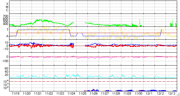 2009/12/22 08:04 更新 C2.5の小規模フレアが発生しました。太陽風は穏やかで、磁気圏も静かです。 2009/12/22 14:30 追加 C7.3の大きめの小規模フレアが発生しました。 2009/12/22 17:06 追加 C7.2フレアは1036黒点群で発生しています。 担当 篠原 SOHO EIT195の写真が更新されています。 これによると、1035黒点群は、もう西の端に没してしまったようです。 また、そのすぐ左に小さく光っているのが1038群、 南西(右下)の明るい領域は1036群のある場所です。 北東(左上)にも明るい領域が見えますが、ここは一時1037群が出現していた場所でしょう。 可視光写真はまだ新しくなっていないため、黒点の様子を見ることはできませんが、 コロナの光り具合が弱いことから、1038群はもう消えているかもしれません。 X線のデータでは、昨日、21日16時(世界時21日7時)に、C2.5の小規模フレアが発生しています。 その後にも、Bクラスの変動が続いています。 どこの領域か分かりませんが、1035群であれば、 もう没してしまったので、今後の影響はないでしょう。 太陽風は、今朝になって急に420km/秒まで速度が上がり、すぐに350km/秒へ下がっています。 短時間の変化で、これだけでは状況がよく分かりません。 磁場強度は4nT前後で、特に目立った変化はしていません。 プラズマの密度が増加しているので、コロナホールの影響が到来しつつあるのかもしれません。 もうしばらく様子を見る必要があります。 磁気圏はとても静かです。 2009/12/22 14:30 追加 (篠原) 関連の図はページの最後にあります GOESのX線観測によると、22日14時(世界時22日5時)頃、 C7.3と大きめの小規模フレアが発生しました。 発生場所は分かりませんが、西の端に隠れた1035黒点群の可能性が高いです。 その場合、実際の規模はもう一段大きかったと思われます。 2009/12/22 17:06 追加 (篠原) 関連の図はページの最後にあります 先ほどのC7.2の小規模フレアは、 太陽の南東(右下)に見える1036黒点群で発生したそうです。 (1035群ではありませんでした) そうなると、引き続き注目したいところです。 SOHO EIT195による太陽コロナ。18日2時半(世界時17日17時半)。 (c) SOHO (ESA & NASA) ![]() GOES衛星の太陽X線データ (c) NOAA/SWPC ![]() ACEが観測した太陽風の磁場(1番上の枠、白線は全体の強度、赤線は南北成分) および、太陽風の密度(3番目の橙線)、速度(4番目の黄線) (c) NOAA/SWPC ![]() リアルタイムAE指数 下段のAEグラフの値が高くなると、オーロラ活動が活発化しています。 (c) 京都大学, NICT ![]() シベリアで観測された3日間の磁場データ 右側の3分の1が、昨日のデータになります。グラフが上がったり下がったりすると、オーロラ活動が活発化しています。 (c) NICT ![]() 27日の太陽周期に合わせたデータプロット 太陽が同じ面を地球に向けていた27日前の変化から、今後を予想することができます。 (c) NICT