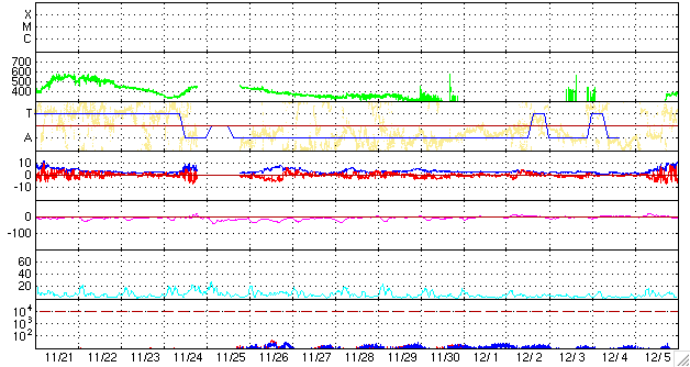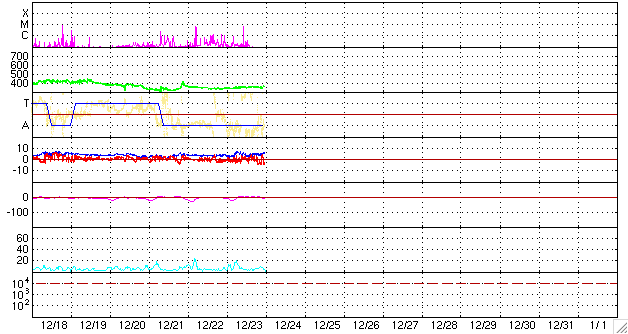 2009/12/24 08:50 更新 1036黒点群でC6のフレアが発生しました。太陽風は低速で、磁気圏も静穏です。 担当 篠原 一昨日に続き、昨日、23日19時(世界時23日10時)にも、 1036黒点群(太陽の南西(右下側)に見える黒点)でC6.4の小規模フレアが発生しました。 短時間型の変動で、CME(太陽ガスの放出現象)は観測されていないようです。 しかし、可視光写真を見ると、1036黒点群は黒点の大きさが昨日よりも小さくなっています。 GOESのX線強度も昨夜のCクラスフレア以降は変化が見られなくなっています。 1036群の活動度は、下がっているようです。 1036黒点群と北半球の1038黒点群は、もうすぐ太陽の向こう側に回っていきます。 一方、EIT195の写真で、太陽の中心から少し南東(左下)に下がったところに、 小さな明るい点があります。 可視光写真を見ると、ここにとても小さな黒点が発生しているようです。 SOHOの磁場写真では、この黒点による小さな磁場の強まりが確認できます。 太陽風は、350km/秒の低速風が安定して続いています。 磁場強度は5nTと平均的な状態です。 どうやら、コロナホールの影響はやって来なかったようです。 太陽風は当分の間、低速の穏やかな状態が続くと思われます。 磁気圏のオーロラ活動も静穏です。 AE指数には、200nTの小さな変化が1つ見えているだけです。 SOHO EIT195による太陽コロナ。24日8時半(世界時23日23時半)。 (c) SOHO (ESA & NASA) ![]() SOHOによる太陽の可視光写真。1036黒点群は小さくなっています。 (c) SOHO (ESA & NASA) ![]() SOHOによる太陽面の磁場分布。 (c) SOHO (ESA & NASA) ![]() GOES衛星の太陽X線データ (c) NOAA/SWPC ![]() ACEが観測した太陽風の磁場(1番上の枠、白線は全体の強度、赤線は南北成分) および、太陽風の密度(3番目の橙線)、速度(4番目の黄線) (c) NOAA/SWPC ![]() リアルタイムAE指数 下段のAEグラフの値が高くなると、オーロラ活動が活発化しています。 (c) 京都大学, NICT ![]() シベリアで観測された3日間の磁場データ 右側の3分の1が、昨日のデータになります。グラフが上がったり下がったりすると、オーロラ活動が活発化しています。 (c) NICT ![]() 27日の太陽周期に合わせたデータプロット 太陽が同じ面を地球に向けていた27日前の変化から、今後を予想することができます。 (c) NICT