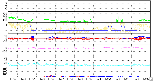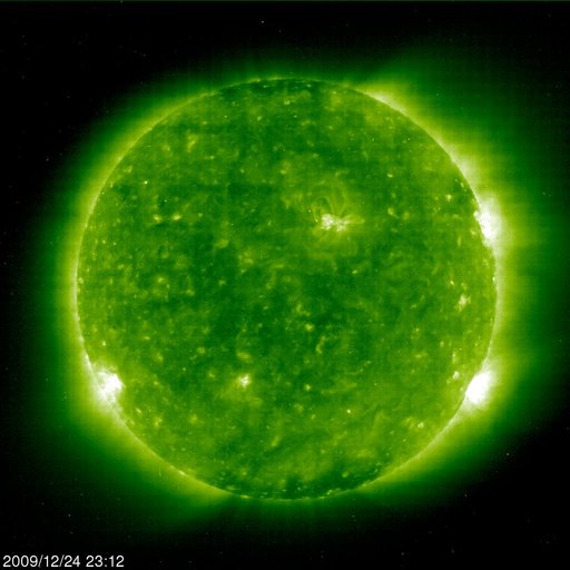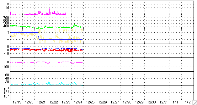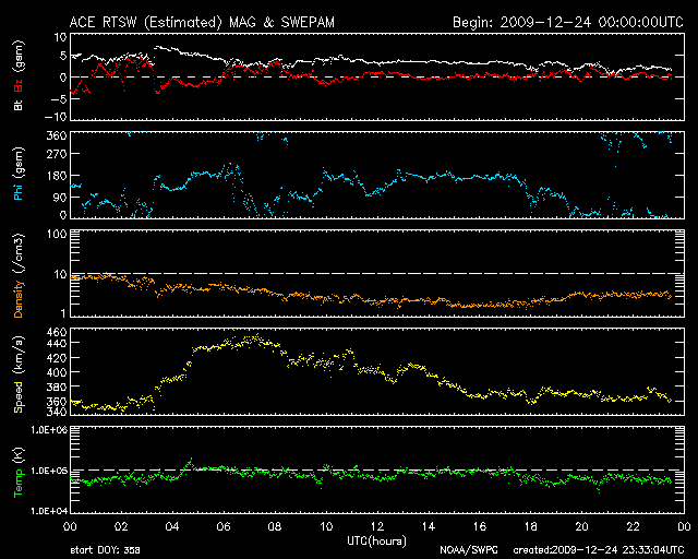 2009/12/25 08:34 更新 太陽は2週間ぶりに無黒点に戻ったようです。太陽風は低速で穏やかです。 担当 篠原 10日近く続いた太陽の活動も、ここで一段落かもしれません。 1036、1038黒点群が西の端に去り、今日の太陽は無黒点となっているようです。 SOHO EIT195の東の端で明るく光っている領域も、可視光写真では白斑が見えるだけです。 12月10日に1034黒点群が現れて以来、 1035、36、37、38黒点群と、太陽にはずっと黒点が見えていたので、 無黒点になるのは2週間ぶりです。 X線の強度は次第に弱まり、変動のない落ち着いたグラフになっています。 太陽風は、昨日の午後、24日14時(世界時24日5時)頃に、急に440km/秒くらいまで速度が上昇し、 半日ほど高まっていました。 昨夜のうちに360km/秒ほどに下がり、現在は低速の状態で安定しています。 オーロラ活動は特に強まらず、磁気圏も概ね静穏です。 太陽風は、このまま年末にかけて穏やかな状態が続くと思われます。 SOHO EIT195の太陽コロナ写真には、コロナホールなどは見られず、 27日周期の図の前周期の太陽風は、ずっと低速です。 SOHO EIT195による太陽コロナ。25日8時(世界時24日23時)。 (c) SOHO (ESA & NASA) ![]() SOHOによる太陽の可視光写真。1036、1038黒点群は見えなくなりました。 (c) SOHO (ESA & NASA) ![]() GOES衛星の太陽X線データ (c) NOAA/SWPC ![]() ACEが観測した太陽風の磁場(1番上の枠、白線は全体の強度、赤線は南北成分) および、太陽風の密度(3番目の橙線)、速度(4番目の黄線) (c) NOAA/SWPC ![]() リアルタイムAE指数 下段のAEグラフの値が高くなると、オーロラ活動が活発化しています。 (c) 京都大学, NICT ![]() シベリアで観測された3日間の磁場データ 右側の3分の1が、昨日のデータになります。グラフが上がったり下がったりすると、オーロラ活動が活発化しています。 (c) NICT ![]() 27日の太陽周期に合わせたデータプロット 太陽が同じ面を地球に向けていた27日前の変化から、今後を予想することができます。 (c) NICT