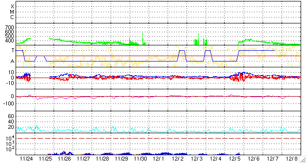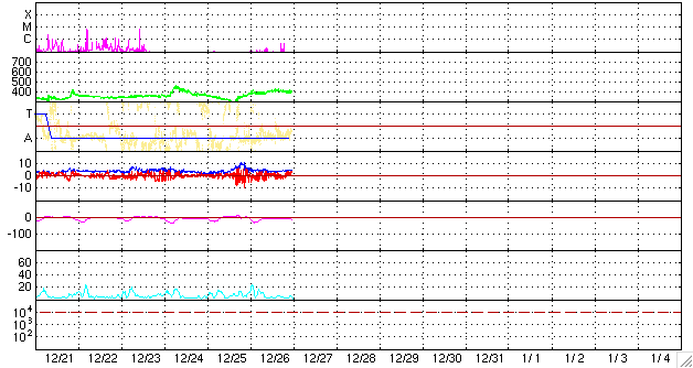 2009/12/27 09:05 更新 1039黒点群が出現しました。Bクラスの小さな変化が見られています。 担当 篠原 太陽の南東(左下)の白斑が見えていた領域に黒点が出現し、1039黒点群と番号が付けられました。 今月10日に1034黒点群が出現して以来、半月ほどのあいだに6群目の出現です。 太陽の活動度の変化は確かな様です。 GOES衛星のX線データでは、Bクラスの小さな変化が見られています。 今後、Cクラスの小規模フレアなどが発生する可能性があります。 1039黒点群の今後の変化に注目して下さい。 太陽風は、昨日の記事の速度変化がそのまま残って、 速度400km/秒と平均的な速度を保っています。 磁場強度は4nTとこちらも平均的なレベルで安定しています。 磁場の南北成分を見ると、細かく南北に変化しています。 速度もそこそこあるためか、AE指数では小さな変化が連続的に観測されています。 規模は小さいですが、オーロラ活動が見られたのかもしれません。 この後も基本的には穏やかな太陽風が続くと思われます。 SOHO EIT195による太陽コロナ。27日8時(世界時26日23時)。 (c) SOHO (ESA & NASA) ![]() SOHOによる太陽の可視光写真。1039黒点群が現れました。 (c) SOHO (ESA & NASA) ![]() GOES衛星の太陽X線データ (c) NOAA/SWPC ![]() ACEが観測した太陽風の磁場(1番上の枠、白線は全体の強度、赤線は南北成分) および、太陽風の密度(3番目の橙線)、速度(4番目の黄線) (c) NOAA/SWPC ![]() リアルタイムAE指数 下段のAEグラフの値が高くなると、オーロラ活動が活発化しています。 (c) 京都大学, NICT ![]() シベリアで観測された3日間の磁場データ 右側の3分の1が、昨日のデータになります。グラフが上がったり下がったりすると、オーロラ活動が活発化しています。 (c) NICT ![]() 27日の太陽周期に合わせたデータプロット 太陽が同じ面を地球に向けていた27日前の変化から、今後を予想することができます。 (c) NICT
