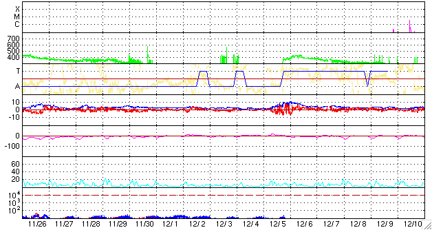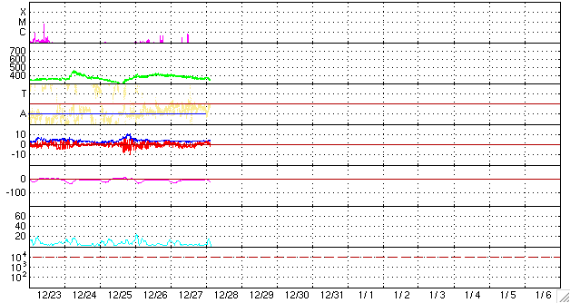 2009/12/28 13:04 更新 1039黒点群は少し大きくなっています。低速の太陽風が続いています。 担当 篠原 1039黒点群は、昨日よりも少し大きくなっています。 活動度はそれほど高くないようで、 昨夜、27日21時(世界時27日12時)に、B8の小さなフレアを起こした程度です。 今後も、小規模フレアの可能性がある程度の様です。 太陽風も穏やかな状態が続いています。 速度は更に下がって、350km/秒ほどとなっています。 磁場強度も4nTで安定していますが、 ACEの図の前半で、南北成分が南向きになっています。 その影響で、AE指数に最大300nTほどの変化が半日ほど続いて観測されています。 小規模ですが、オーロラの活動が見られたようです。 この後も、低速の穏やかな太陽風が続きそうです。 前周期の今ごろ、EIT195の太陽コロナ写真では、北半球側に淡いコロナホールが見えていました。 しかし、現在、そのコロナホールはかなり淡くなり、若干薄暗い箇所が見られる程度です。 27日周期の図では、前周期でもコロナホールの影響は微弱で、 12月6日前後に太陽風の速度が400km/秒に上がった程度でした。 今回のコロナホールの様子ではその影響は更に弱まって、 このまま年始にかけて低速の太陽風が続きそうです。 SOHO EIT195による太陽コロナ。28日13時(世界時28日4時)。 (c) SOHO (ESA & NASA) ![]() SOHOによる太陽の可視光写真。南東に1039黒点群が見えています。 (c) SOHO (ESA & NASA) ![]() GOES衛星の太陽X線データ (c) NOAA/SWPC ![]() ACEが観測した太陽風の磁場(1番上の枠、白線は全体の強度、赤線は南北成分) および、太陽風の密度(3番目の橙線)、速度(4番目の黄線) (c) NOAA/SWPC ![]() リアルタイムAE指数 下段のAEグラフの値が高くなると、オーロラ活動が活発化しています。 (c) 京都大学, NICT ![]() シベリアで観測された3日間の磁場データ 右側の3分の1が、昨日のデータになります。グラフが上がったり下がったりすると、オーロラ活動が活発化しています。 (c) NICT ![]() 27日の太陽周期に合わせたデータプロット 太陽が同じ面を地球に向けていた27日前の変化から、今後を予想することができます。 (c) NICT