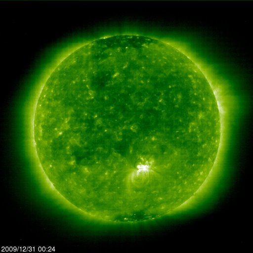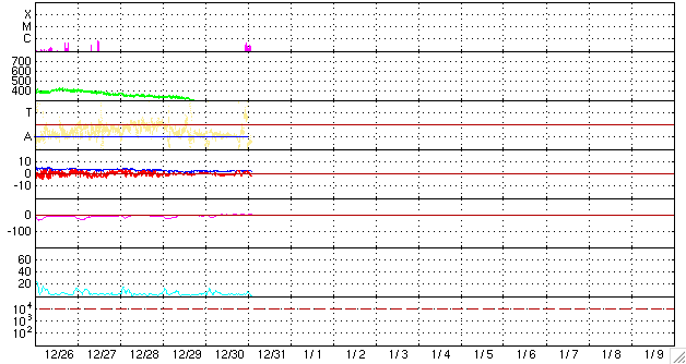 2009/12/31 12:20 更新 太陽風は270km/秒とかなり低速の状態です。このまま静かに年越しとなるでしょう。 担当 篠原 12月28日に宇宙天気ニュースのアクセス累計が250万件に達しました。 これまでの経過をまとめましたので、ご覧ください。 宇宙天気ニュース250万カウント到達 太陽風は、昨日から、270〜280km/秒とかなり遅い状態で安定しています。 磁場強度も3nTと弱まったままです。 このため、磁気圏も静穏です。 AE指数はほとんど変化していません。 このまま年始にかけて、穏やかな太陽風が続きそうです。 昨日も書きましたが、27日周期の図によると、 1月2日前後に400km/秒くらいの速度の高まりが見られるかもしれません。 しかし、対応するコロナホールはとても淡くなっていて、 目立った影響はやって来ないように思われます。 その場合、1月10日頃まで低速の太陽風が続くでしょう。 太陽では、1039黒点群の形がまた変化しています。 今日の様子は、右と左に2つに分かれたようになっています。 X線のグラフを見ると、静穏レベルがBクラスへ少し高まっています。 フレアの様な変動は特に見られませんが、今後の変化に注目してください。 さて、2009年も今日までとなりました。 この1年間ご愛読いただいて、どうもありがとうございました。 2010年は、太陽活動がどこまで高まるのかが最大の注目になると思います。 引き続き、気長に宇宙天気をご覧ください。 それでは、どうぞよいお年をお迎えください。 SOHO EIT195による太陽コロナ。31日9時半(世界時31日0時半)。 (c) SOHO (ESA & NASA) ![]() SOHOによる太陽の可視光写真。1039黒点群が見えています。 (c) SOHO (ESA & NASA) ![]() ACEが観測した太陽風の磁場(1番上の枠、白線は全体の強度、赤線は南北成分) および、太陽風の密度(3番目の橙線)、速度(4番目の黄線) (c) NOAA/SWPC ![]() リアルタイムAE指数 下段のAEグラフの値が高くなると、オーロラ活動が活発化しています。 (c) 京都大学, NICT ![]() シベリアで観測された3日間の磁場データ 右側の3分の1が、昨日のデータになります。グラフが上がったり下がったりすると、オーロラ活動が活発化しています。 (c) NICT ![]() 27日の太陽周期に合わせたデータプロット 太陽が同じ面を地球に向けていた27日前の変化から、今後を予想することができます。 (c) NICT