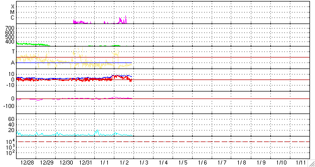 2010/ 1/ 3 08:25 更新 1039黒点群がCクラスフレアを3回起こしました。太陽風は低速で、磁気圏も静穏です。 担当 篠原 昨日から今朝にかけて、1039黒点群で、Cクラスの小規模フレアが3回発生しています。 2日16時(世界時2日7時)に、C1.0、 2日23時(世界時2日14時)に、C2.6、 そして、つい先ほど、3日8時(世界時2日23時)に、C3です。 小規模フレアばかりですが、1039群が連続的に活動を起こしています。 引き続き、小中規模のフレアを起こす可能性がありますので、注目してください。 一方、太陽風はとても遅い状態が続いています。 昨日の磁場強度の高まりは、そのまま今朝まで7〜8nT付近で残っていました。 しかし、速度の変化は、300km/秒を超えたくらいで頭打ちになり、 昨夜のうちに280km/秒へ下がりました。 磁場強度も、現在は5nTヘと弱まっています。 結局、太陽風の変化はやってきませんでした。 この後も、1月10日頃まで低速の状態が続きそうです。 太陽風磁場の南北成分は、ずっと北向きが続き、 オーロラ活動は全く強まりませんでした。 AE指数は平坦なままです。 今朝になって、磁場は南に転じていますが、 強度が落ちてきているので、もう、強い影響を持つことはないでしょう。 もちろん、小規模のオーロラ活動は期待できます。 SOHOによる太陽の可視光写真。1039黒点群が見えています。 (c) SOHO (ESA & NASA) ![]() GOES衛星の太陽X線データ (c) NOAA/SWPC ![]() ACEが観測した太陽風の磁場(1番上の枠、白線は全体の強度、赤線は南北成分) および、太陽風の密度(3番目の橙線)、速度(4番目の黄線) (c) NOAA/SWPC ![]() リアルタイムAE指数 下段のAEグラフの値が高くなると、オーロラ活動が活発化しています。 (c) 京都大学, NICT ![]() シベリアで観測された3日間の磁場データ 右側の3分の1が、昨日のデータになります。グラフが上がったり下がったりすると、オーロラ活動が活発化しています。 (c) NICT ![]() 27日の太陽周期に合わせたデータプロット 太陽が同じ面を地球に向けていた27日前の変化から、今後を予想することができます。 (c) NICT