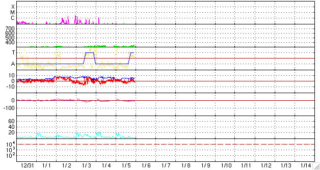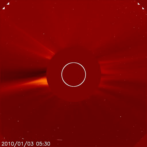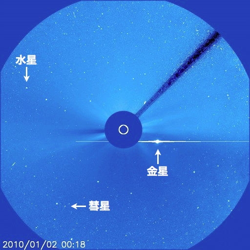 2010/ 1/ 6 09:05 更新 SOHOできれいな彗星が見えました。太陽は無黒点、太陽風は低速で、どちらも穏やかです。 担当 篠原 新年早々、小型の彗星が太陽に接近し、 長い尾を伸ばす様子がSOHO LASCOカメラで撮影されました。 LASCO C3、C2それぞれを動画にしていますのでご覧ください。 LASCO C3では、水星と金星も同時に見えています。 金星は太陽の向こう側を通っているため、たいへん明るく輝いていますが、 水星は太陽と地球の間を通っているので、暗く見えています。 彗星は、太陽を通過した後に姿を現しておらず、蒸発してしまったようです。 太陽では、1039黒点群が西の端に没してしまいました。 このため、現在は無黒点となっています。 最新のSOHO EIT195によると、 昨日STEREO Behindで紹介した東側の活動領域は、まだ上がってきておらず、 この領域が見えてきた時に、黒点が存在しているかどうか注目されます。 太陽風は、速度300km/秒付近と低速で安定しています(ACEの図の黄色線)。 磁場強度(白線)は、5nTと平均的な強さです。 南北成分(赤線)が、振幅は小さいですが 長時間南に寄った(赤線がマイナスに振れる)時間帯があります。 ここで200nTほどの小振幅の変動がAE指数に観測されました。 多少、オーロラ活動が見られたのでしょうか。 この後も、太陽風は低速の状態が続くと思われます。 昨日のSTEREO Behindで見えていたコロナホールは、 SOHO EIT195では、かすかな影が東の端に見えています。 もう2日ほどすると、よく見えるようになるでしょう。 次の太陽風の変動は、この領域からの影響が考えられます。 SOHO LASCO C3カメラで、小さな彗星が太陽に接近しました。水星と金星も見えています。 (c) SOHO (ESA & NASA)、動画加工 : 宇宙天気ニュース ![]() SOHO LASACO C2による彗星接近の様子。 (c) SOHO (ESA & NASA)、動画加工 : 宇宙天気ニュース ![]() SOHO EIT195による太陽コロナ。6日7時半(世界時5日22時半)。 (c) SOHO (ESA & NASA) ![]() SOHOによる太陽可視光写真。1039黒点群は、西に没しました。 (c) SOHO (ESA & NASA) ![]() GOES衛星の太陽X線データ (c) NOAA/SWPC ![]() ACEが観測した太陽風の磁場(1番上の枠、白線は全体の強度、赤線は南北成分) および、太陽風の密度(3番目の橙線)、速度(4番目の黄線) (c) NOAA/SWPC ![]() リアルタイムAE指数 下段のAEグラフの値が高くなると、オーロラ活動が活発化しています。 (c) 京都大学, NICT ![]() シベリアで観測された3日間の磁場データ 右側の3分の1が、昨日のデータになります。グラフが上がったり下がったりすると、オーロラ活動が活発化しています。 (c) NICT ![]() 27日の太陽周期に合わせたデータプロット 太陽が同じ面を地球に向けていた27日前の変化から、今後を予想することができます。 (c) NICT