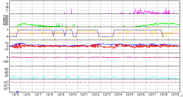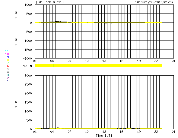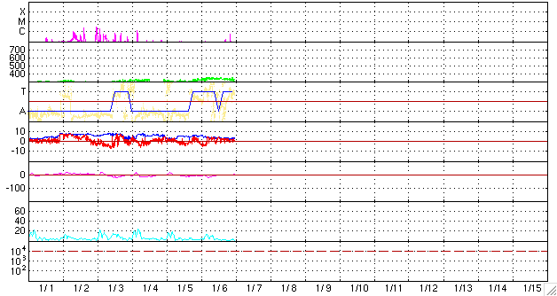 2010/ 1/ 7 09:08 更新 太陽の東端から活動領域が上がってきました。太陽風は低速で、磁気圏も静穏です。 担当 篠原 太陽の東の端から、新しい活動領域が顔を出しました。 可視光写真では、うっすらと白斑が見えるだけで、 黒点があるのかどうかはまだ分かりません。 この領域は、27日前に大きな姿を見せていた1035黒点群があった場所です。 挨拶代わりか、B6の小さなフレアを起こしています(7日5時(世界時6日20時))。 どの程度の活動度なのか、今後の変動に注目してください。 太陽風は、速度330km/秒と低速状態で安定しています。 磁場強度は3〜4nTとやや弱めです。 磁気圏も静穏で、AE指数は全く変化していません。 SOHO EIT195では、コロナホールが少しずつ見やすくなっています。 あまり濃くは見えませんが、もう3日ほどすると太陽の中心に達しそうです。 来週の中程に、太陽風速度の高まりがやって来るかもしれません。 SOHO EIT195による太陽コロナ。7日8時半(世界時6日23時半)。 (c) SOHO (ESA & NASA) ![]() SOHOによる、太陽可視光写真。東端に白斑が見えます。 (c) SOHO (ESA & NASA) ![]() GOES衛星の太陽X線データ (c) NOAA/SWPC ![]() ACEが観測した太陽風の磁場(1番上の枠、白線は全体の強度、赤線は南北成分) および、太陽風の密度(3番目の橙線)、速度(4番目の黄線) (c) NOAA/SWPC ![]() リアルタイムAE指数 下段のAEグラフの値が高くなると、オーロラ活動が活発化しています。 (c) 京都大学, NICT ![]() シベリアで観測された3日間の磁場データ 右側の3分の1が、昨日のデータになります。グラフが上がったり下がったりすると、オーロラ活動が活発化しています。 (c) NICT ![]() 27日の太陽周期に合わせたデータプロット 太陽が同じ面を地球に向けていた27日前の変化から、今後を予想することができます。 (c) NICT