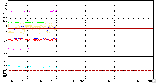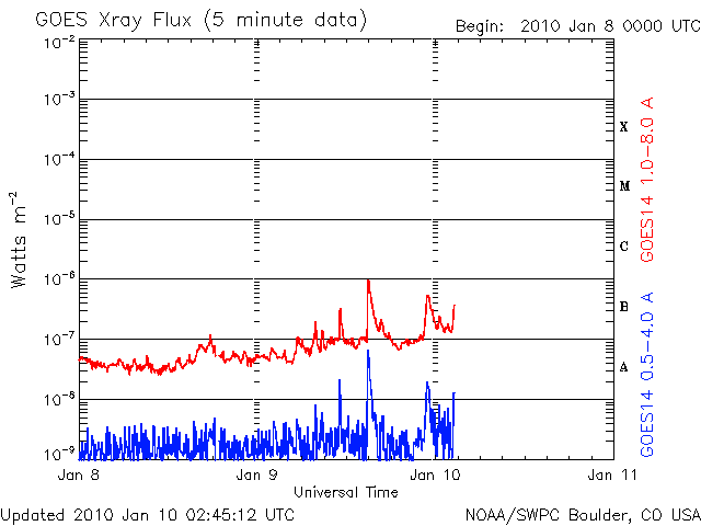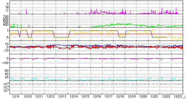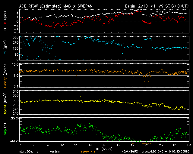 2010/ 1/10 11:45 更新 1040黒点群でC1の小規模フレアが発生しました。太陽風はとても低速です。 担当 篠原 10日0時(世界時9日15時)に、1040黒点群でC1.0の小規模フレアが発生しました。 その前後にも、Bクラスの小さなフレアが数回起きています。 GOESのX線グラフの強度レベルも少し上がっていることから、 1040黒点群の活動度はやや強まっているようです。 可視光写真で見える黒点の数も増えています。 1040黒点群では、今後も小規模フレアの発生が考えられます。 太陽風は、低速状態が続いています。 昨日の300km/秒から、今朝になって、270km/秒まで低下しています。 かなり遅い風です。 磁気圏のオーロラ活動も、基本的には穏やかです。 AE指数には、小さな変動が見えていますが、 これは、太陽風磁場が-3nTほどの南向きになっていた影響です。 他が全く静かなために目立っていますが、活動としてはかなり小さなものです。 SOHO EIT195では、コロナホールが太陽の中心線上に来ています。 12〜13日頃に、影響がやって来るでしょう。 オーロラ観望では、楽しみにしてください。 SOHO EIT195による太陽コロナ。10日11時(世界時10日2時)。 (c) SOHO (ESA & NASA) ![]() SOHOによる太陽の可視光写真。1040黒点群の黒点が増えています。 (c) SOHO (ESA & NASA) ![]() GOES衛星の太陽X線データ (c) NOAA/SWPC ![]() ACEが観測した太陽風の磁場(1番上の枠、白線は全体の強度、赤線は南北成分) および、太陽風の密度(3番目の橙線)、速度(4番目の黄線) (c) NOAA/SWPC ![]() リアルタイムAE指数 下段のAEグラフの値が高くなると、オーロラ活動が活発化しています。 (c) 京都大学, NICT ![]() シベリアで観測された3日間の磁場データ 右側の3分の1が、昨日のデータになります。グラフが上がったり下がったりすると、オーロラ活動が活発化しています。 (c) NICT ![]() 27日の太陽周期に合わせたデータプロット 太陽が同じ面を地球に向けていた27日前の変化から、今後を予想することができます。 (c) NICT