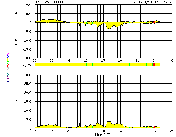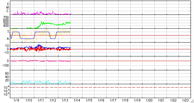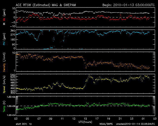 2010/ 1/14 11:06 更新 太陽風は500km/秒台を回復しています。小規模のオーロラ活動も見られました。 担当 篠原 昨日のニュース以降、太陽風の速度は440km/秒で安定していましたが、 日付が今日に変わった、14日0時(世界時13日15時)に、再び500km/秒台に上昇しました。 現在までこの状態が続いています。 昨日予想していたよりも速度が高まった印象です。 磁場強度は5nTと平均的なレベルが続いています。 そして、南北成分は、小さな振幅ですが南寄りになっています。 この影響で、オーロラ活動も弱いながらに活発化しています。 AE指数は、200〜400nTくらいの小規模変動が連続的に見られています。 北極の空はどうだったのでしょうか。 SOHO EIT195を見ると、コロナホールはすっかり西の端に遠ざかっています。 このため、高速風はそれほど長く続かないと思います。 27日周期の図の前周期と比べると、明日くらいまでは続くかもしれません。 太陽の1040黒点群は、黒点が大きなかたまりになって来ているようです。 X線の変動は見られなくなり、活動度は下がっている様に思います。 それでも黒点の規模はまだ大きいですから、フレア活動に注目してください。 SOHO EIT195による太陽コロナ。14日9時半(世界時14日0時半)。 (c) SOHO (ESA & NASA) ![]() SOHOによる、太陽可視光写真。1040黒点群が見えています。 (c) SOHO (ESA & NASA) ![]() ACEが観測した太陽風の磁場(1番上の枠、白線は全体の強度、赤線は南北成分) および、太陽風の密度(3番目の橙線)、速度(4番目の黄線) (c) NOAA/SWPC ![]() リアルタイムAE指数 下段のAEグラフの値が高くなると、オーロラ活動が活発化しています。 (c) 京都大学, NICT ![]() シベリアで観測された3日間の磁場データ 右側の3分の1が、昨日のデータになります。グラフが上がったり下がったりすると、オーロラ活動が活発化しています。 (c) NICT ![]() 27日の太陽周期に合わせたデータプロット 太陽が同じ面を地球に向けていた27日前の変化から、今後を予想することができます。 (c) NICT