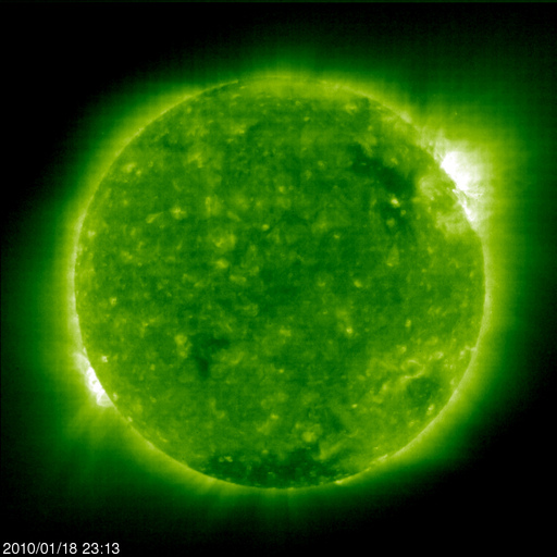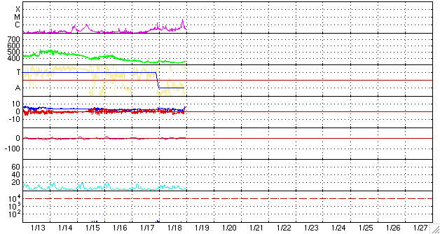 2010/ 1/19 08:49 更新 太陽風は低速です。これから高速風がやって来る可能性があります。 担当 篠原 1040黒点群が西の端に消えていきました。 今日の太陽は無黒点です。 今朝、19日5時(世界時18日20時)に、C4.9の小規模フレアが発生しました。 発生箇所は、SOHOやSTEREOの様子を見ているのですがはっきりしません。 SOHOの南東端(左下)に少し顔を出している、新しい領域かもしれません。 STEREO Behindの動画を見ていると、この領域は細かい活動を続けていて、 今後太陽のこちら側に来た時に注意が必要です。 太陽風は、今朝になって磁場強度が3nTから6nTほどに若干上昇しています。 この程度ではまだはっきりしませんが、 この後も増加が続くようだと、高速風が近づいている可能性があります。 現在の太陽風の速度は、340km/秒前後と低速です。 ACEの図では、磁場の南北成分(赤線)が弱いながらも南向き(マイナス)になった時間帯があり、 その影響で、AE指数に200〜300nTほどの小さな変動が観測されています。 これからコロナホールの影響が始まるのかどうか、 ACEのデータに注目してください。 また、オーロラの活動が強まることも期待できます。 SOHO EIT195による太陽コロナ。19日8時(世界時18日23時)。 (c) SOHO (ESA & NASA) ![]() SOHOによる、太陽可視光写真。1040黒点群は見えなくなりました。 (c) SOHO (ESA & NASA) ![]() GOES衛星の太陽X線データ (c) NOAA/SWPC ![]() ACEが観測した太陽風の磁場(1番上の枠、白線は全体の強度、赤線は南北成分) および、太陽風の密度(3番目の橙線)、速度(4番目の黄線) (c) NOAA/SWPC ![]() リアルタイムAE指数 下段のAEグラフの値が高くなると、オーロラ活動が活発化しています。 (c) 京都大学, NICT ![]() 27日の太陽周期に合わせたデータプロット 太陽が同じ面を地球に向けていた27日前の変化から、今後を予想することができます。 (c) NICT