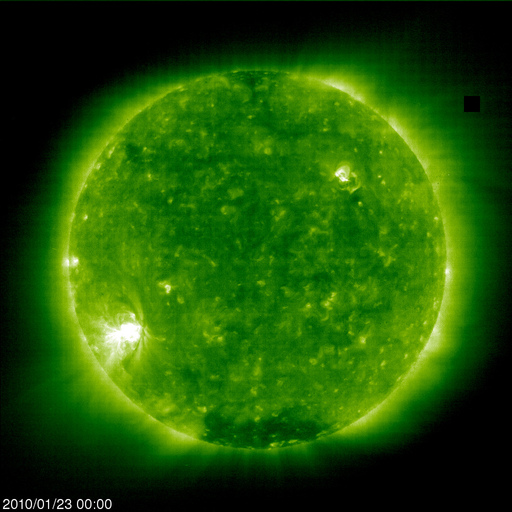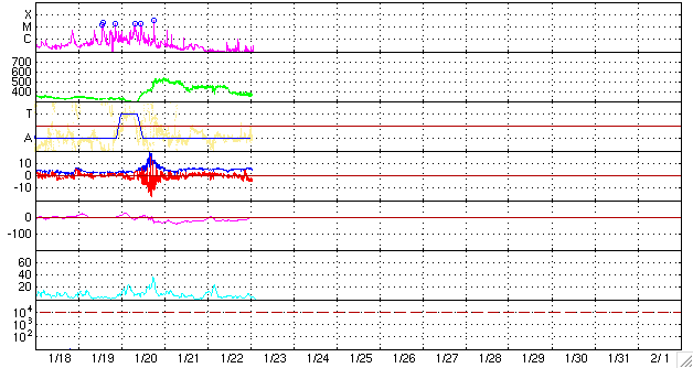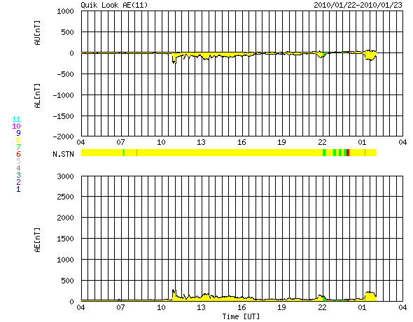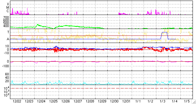 2010/ 1/23 12:08 更新 1042黒点群が出現しました。太陽風は速度が下がり、低速風に変わりつつあります。 担当 篠原 太陽のこちら側に顔を出した途端、1041黒点群は勢いを失ったようです。 昨日もX線のグラフではBクラスの小さな変化が見られるだけで、 全体的な強度も下がっています。 可視光写真を見ると、1041黒点群はまだまだ大きな姿を見せており、 このまま静かに衰えていくのか、あるいは再び活動を活発化するのでしょうか。 中小規模のフレアに対する注意は引き続き必要です。 また、太陽の中心から北西(右上)に、新しい黒点が出現しました。 1042黒点群と番号が付けられています。 太陽風は、昨夜のうちに速度が400km/秒を割り、380km/秒とやや低速の状態になっています。 磁場強度は、5nT前後とあまり変化していません。 速度が下がって、磁気圏のオーロラ活動も弱まっています。 AE指数には小さな変化が見られるだけです。 太陽風はこの後低速風に変わるでしょう。 しばらくは目立ったコロナホールもなく、2週間近く静かな状態が続くかもしれません。 SOHO EIT195による太陽コロナ。23日9時(世界時23日0時)。 (c) SOHO (ESA & NASA) ![]() SOHOによる太陽可視光写真。1042黒点群が出現しました。 (c) SOHO (ESA & NASA) ![]() GOES衛星の太陽X線データ (c) NOAA/SWPC ![]() ACEが観測した太陽風の磁場(1番上の枠、白線は全体の強度、赤線は南北成分) および、太陽風の密度(3番目の橙線)、速度(4番目の黄線) (c) NOAA/SWPC ![]() リアルタイムAE指数 下段のAEグラフの値が高くなると、オーロラ活動が活発化しています。 (c) 京都大学, NICT ![]() シベリアで観測された3日間の磁場データ 右側の3分の1が、昨日のデータになります。グラフが上がったり下がったりすると、オーロラ活動が活発化しています。 (c) NICT ![]() 27日の太陽周期に合わせたデータプロット 太陽が同じ面を地球に向けていた27日前の変化から、今後を予想することができます。 (c) NICT