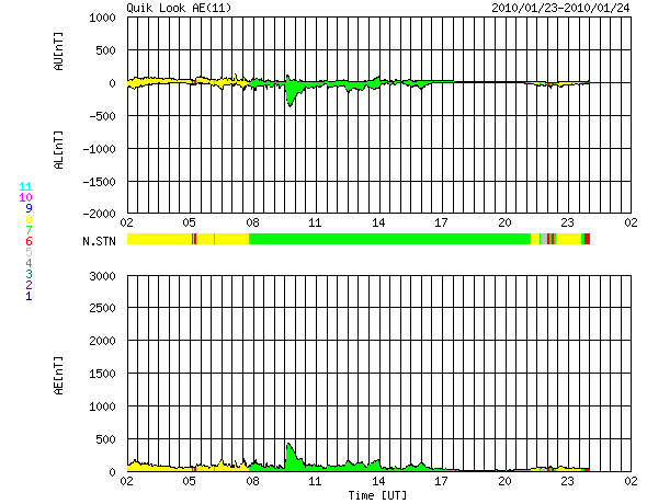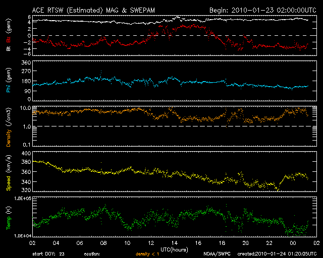 2010/ 1/24 10:20 更新 太陽風は低速風になりました(340km/秒)。太陽の活動も落ち着いています。 担当 篠原 太陽風の速度はゆっくりと下がって、340km/秒になっています。 すっかり低速太陽風になりました。 磁場強度は、5nTと平均的な強さを保っています。 面白いことに、磁場の南北成分が長い時間南を向いています。 その影響でしょう、オーロラの活動を示すAE指数も、 小さな変化が長い時間見られています。 太陽風は、このまま低速状態が当分続くことになりそうです。 27日周期の図では、前周期の速度のグラフはずっと300km/秒を割った状態です。 SOHO EIT195の太陽コロナにも、コロナホールは見られません。 昨日は、静止衛星(GOES)の高エネルギー電子のグラフが、久しぶりに増加しました。 といっても、10^1と、全く問題のない非常に低いレベルの変化です。 (問題になるのは、10^4くらいです) それでも、1カ月ぶりの上昇です。 太陽は、Bクラスの小さな変動が続いていますが、目立ったフレア活動は起きていません。 (2カ月前までは、このレベルでも話題になるような活動だったのですが) 新しく現れた1042黒点群も、黒点としては広がっていますが、活動は落ち着いているようです。 1041黒点群とともに、引き続き小中規模のフレアに注意が必要です。 SOHO EIT195による太陽コロナ。24日10時(世界時24日1時)。 (c) SOHO (ESA & NASA) ![]() SOHOによる太陽可視光写真。2つの黒点群が見えています。 (c) SOHO (ESA & NASA) ![]() ACEが観測した太陽風の磁場(1番上の枠、白線は全体の強度、赤線は南北成分) および、太陽風の密度(3番目の橙線)、速度(4番目の黄線) (c) NOAA/SWPC ![]() リアルタイムAE指数 下段のAEグラフの値が高くなると、オーロラ活動が活発化しています。 (c) 京都大学, NICT ![]() シベリアで観測された3日間の磁場データ 右側の3分の1が、昨日のデータになります。グラフが上がったり下がったりすると、オーロラ活動が活発化しています。 (c) NICT ![]() 27日の太陽周期に合わせたデータプロット 太陽が同じ面を地球に向けていた27日前の変化から、今後を予想することができます。 (c) NICT