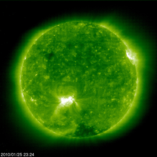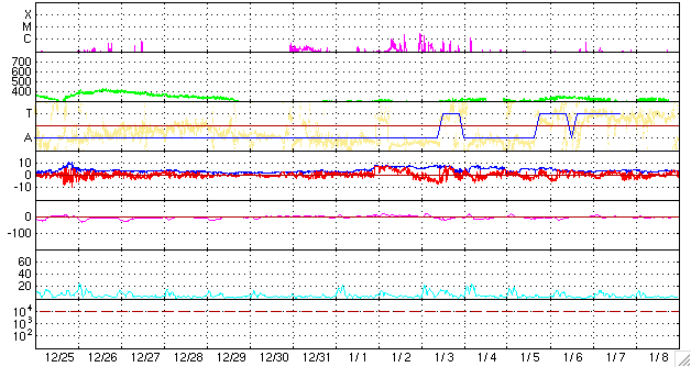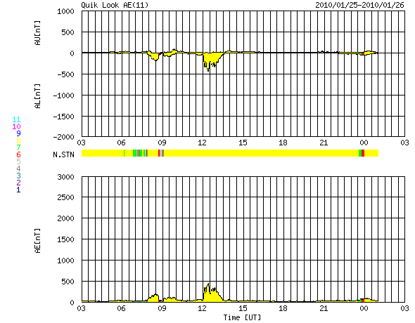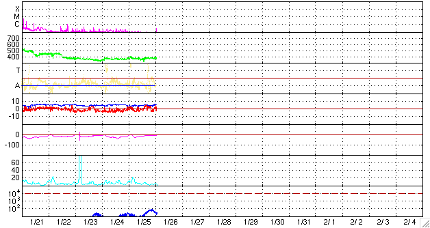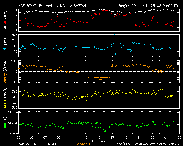 2010/ 1/26 11:16 更新 太陽の活動は穏やかです。太陽風は低速ですが、小規模のオーロラ活動が発生しています。 担当 篠原 SOHOの可視光写真が変な状態になっています(最新の写真は更にひどいです)。 機器の故障でなければいいのですが。 太陽の活動は更に穏やかになっています。 昨日は、Bクラスの変化すらほとんど見られなくなりました。 太陽は、この後も穏やかに推移しそうです。 X線の観測では、今朝、Bクラスの小さな変化が発生していて、 この変動が続くかどうかというのも、今後を見るための指標となるでしょう。 太陽風は、昨日からほとんど変わらず、速度370km/秒とやや低速の風が続いています。 磁場強度は、4〜6nTの間にあり、平均的な状態です。 磁場の南北成分は、一方的な南向きから、 南北に数時間置きに切り替わるようになっています。 そのため、南を向いた頃にオーロラ活動が発生するという変化をしています。 太陽風を測っているACE衛星は、 地球から150万kmほど太陽寄りに離れて飛んでいます。 そこから地球まで、今日のような370km/秒の風だと1時間10分ほどかかります。 従って、ACEと地上のデータを比べる時は、 この時差も意識して見ると見やすくなります。 オーロラの活動度を示すAE指数は、200〜400nTと小規模の変化です。 速度が遅めなので、この程度の変化になっています。 遅い太陽風はまだまだ続きます。 27日周期の図では、前周期の速度のグラフはずっと低速です。 SOHO EIT195による太陽コロナ。26日8時半(世界時25日23時半)。 (c) SOHO (ESA & NASA) ![]() SOHOによる太陽可視光写真。1041黒点群と、1042黒点群が見えています。 (c) SOHO (ESA & NASA) ![]() GOES衛星の太陽X線データ (c) NOAA/SWPC ![]() ACEが観測した太陽風の磁場(1番上の枠、白線は全体の強度、赤線は南北成分) および、太陽風の密度(3番目の橙線)、速度(4番目の黄線) (c) NOAA/SWPC ![]() リアルタイムAE指数 下段のAEグラフの値が高くなると、オーロラ活動が活発化しています。 (c) 京都大学, NICT ![]() シベリアで観測された3日間の磁場データ 右側の3分の1が、昨日のデータになります。グラフが上がったり下がったりすると、オーロラ活動が活発化しています。 (c) NICT ![]() 27日の太陽周期に合わせたデータプロット 太陽が同じ面を地球に向けていた27日前の変化から、今後を予想することができます。 (c) NICT