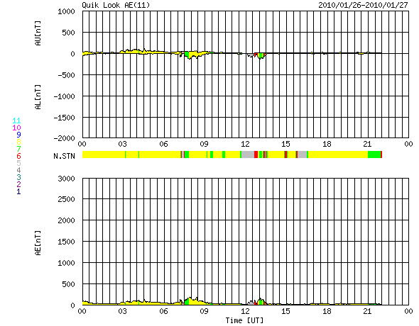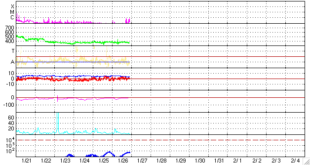 2010/ 1/27 08:36 更新 太陽風は低速で、磁気圏も静穏です。1041黒点群は縮小しています。 担当 篠原 SOHOの可視光写真の異常は、一時的なものだったようです。 現在は正常に戻っています。 太陽の中ほどに見える1041黒点群は、昨日よりも小さくなっています。 目立った活動もしなくなり、黒点としても縮小しているようです。 もうひとつの1042黒点群は、西の端に消えていきました。 この黒点群は少し活動度が上がったようで、 GOESのX線データで、Bクラスの小さなフレアが観測されています。 STEREO Aheadの動画でも、その様子を見ることができました。 地球からは太陽の向こう側に回ってしまったので、今後の影響はありません。 太陽風は、昨日と変わらず、360km/秒前後と遅めの速度で安定しています。 磁場強度も、4〜6nTと平均的な強さが続いています。 4日半ほどこの状態が続いています。 太陽風の磁場は、0nTから北寄りに推移するようになり、 オーロラ活動はおとなしくなっています。 AE指数で100nTほどの小さな変化が見られる程度です。 今後も低速の太陽風が続くでしょう。 オーロラ活動については、南北成分が南寄りになれば、小規模の活動が期待できますが、 今日のように北寄りに推移すると、とても穏やかになってしまいます。 27日周期の予想では、次の太陽風の変動の始まりは、2月7日頃になりそうです。 10日ほど先のことです。 SOHO EIT195による太陽コロナ。27日6時半(世界時26日21時半)。 (c) SOHO (ESA & NASA) ![]() SOHOによる太陽可視光写真。1042黒点群は西に没しました。 (c) SOHO (ESA & NASA) ![]() GOES衛星の太陽X線データ (c) NOAA/SWPC ![]() ACEが観測した太陽風の磁場(1番上の枠、白線は全体の強度、赤線は南北成分) および、太陽風の密度(3番目の橙線)、速度(4番目の黄線) (c) NOAA/SWPC ![]() リアルタイムAE指数 下段のAEグラフの値が高くなると、オーロラ活動が活発化しています。 (c) 京都大学, NICT ![]() シベリアで観測された3日間の磁場データ 右側の3分の1が、昨日のデータになります。グラフが上がったり下がったりすると、オーロラ活動が活発化しています。 (c) NICT ![]() 27日の太陽周期に合わせたデータプロット 太陽が同じ面を地球に向けていた27日前の変化から、今後を予想することができます。 (c) NICT