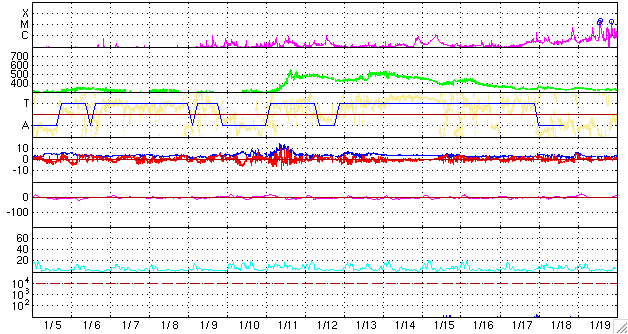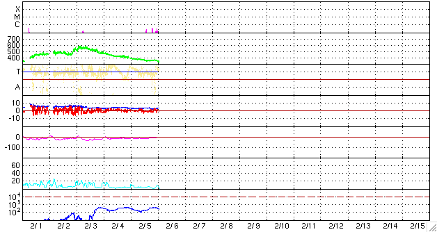 2010/ 2/ 6 11:06 更新 太陽では、Bクラスの小さな活動が起こり始めています。太陽風は低速で、磁気圏も穏やかです。 担当 篠原 太陽が、また少しにぎわっています。 昨日現れた小さな黒点は、1044黒点群と番号が付きました。 その上に見える1043黒点群とともに、小さなBクラスのフレアを起こしている様です。 また、北東(左上)側から上がってきた活動領域は、黒点は見られないものの、 EIT195では広い範囲にわたってコロナが明るく輝いています。 部分的に活動が強まっている領域もあるようで、その辺りから黒点が出現するかもしれません。 X線のデータで見られるフレア活動とともに、今後の変化に注目してください。 太陽風は、速度は更に低下して、330km/秒ほどの低速風になっています。 磁場強度も3〜4nTとやや弱まった状態です。 EIT195では、北半球のコロナホールが太陽の中心線に達しています。 この状態だと、3日後の2月9日くらいから影響が始まりそうです。 27日前の太陽と比較すると、コロナホールの位置は東側に1日分ほどずれています。 27日周期の図で予想される高速風の到来(7〜8日頃)よりも、遅れて始まる可能性が高そうです。 現在の磁気圏活動は静穏です。 AE指数は小さな変化が発生している程度です。 次の太陽風の乱れまで、この状態が続きそうです。 SOHO EIT195による太陽コロナ。6日10時半(世界時6日1時半)。 (c) SOHO (ESA & NASA) ![]() SOHOによる太陽可視光写真。1043黒点群とその左下に1044黒点群が見えます。 (c) SOHO (ESA & NASA) ![]() GOES衛星の太陽X線データ (c) NOAA/SWPC ![]() ACEが観測した太陽風の磁場(1番上の枠、白線は全体の強度、赤線は南北成分) および、太陽風の密度(3番目の橙線)、速度(4番目の黄線) (c) NOAA/SWPC ![]() リアルタイムAE指数 下段のAEグラフの値が高くなると、オーロラ活動が活発化しています。 (c) 京都大学, NICT ![]() シベリアで観測された3日間の磁場データ 右側の3分の1が、昨日のデータになります。グラフが上がったり下がったりすると、オーロラ活動が活発化しています。 (c) NICT ![]() 27日の太陽周期に合わせたデータプロット 太陽が同じ面を地球に向けていた27日前の変化から、今後を予想することができます。 (c) NICT