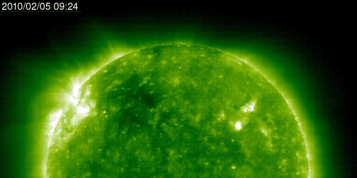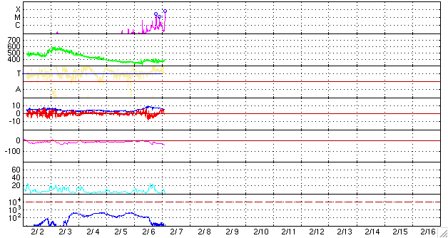 2010/ 2/ 7 11:54 更新 1045黒点群が一気に発達し、中規模フレアを3回起こしています。 担当 篠原 SOHOのEIT195で太陽の北東側に明るく見えていた領域が一気に発達し、 黒点が出現するとともに、Mクラスの中規模フレアを起こしています。 黒点群は1045黒点群と番号が付けられました。 大きな黒点が3つと、その周囲に小さな黒点の分布も見えます。 そして、活動領域の発達に伴ってX線の強度が高まり、フレア活動が始まっています。 NOAAのレポートによると、 これまでに、Mクラスが2回、Cクラスが5回発生しています。 今日の早朝、7日4時(世界時6日19時)に、M2.9、 続いて、7日6時半(世界時6日21時半)に、M1.3などです。 と書いているところに、M6.4の中規模フレアが発生しました。 7日11時半(世界時7日2時半)です。 掲載のX線の図の右端に発生した変化です。 M5以上の規模のフレアの発生は、2007年6月以来、2年8カ月ぶりです。 黒点群の発達の様子を見るため、この2日間の変化を動画にしました。 EIT195の太陽コロナ、可視光、磁場と3種類の動画をどうぞ。 EIT195では、フレアに伴ってコロナが激しく輝いている様子が分かります。 可視光写真では、撮影間隔の問題もありますが、黒点群が一気に出現した様子がよく分かります。 また、磁場写真を見ると、黒点が現れる前に、 磁場の分布が次第に強まっていた様子を見ることができます。 1045黒点群は、今後もフレア活動を続けると思われます。 NOAA/SWPCの予報では、活動は中規模フレアくらいまでとのことですが、 引き続き、注意してください。 太陽風は、360〜380km/秒と少し速度を上げていますが、低速風が続いています。 磁場強度は、5nTから9nTくらいまで一旦強まり、また5nTに戻っています。 この強まりに伴って、磁場が南向きに偏るようになり、 その影響でAE指数300〜600nTの中小規模のオーロラ活動が発生しています。 コロナホールの位置から考えると、高速風の到来はもう少し先だと思いますが、 前周期のパターンだと、今日の夜くらいから始まる可能性もあります。 太陽の活動に目が行ってしまいますが、太陽風、オーロラ活動にも注目してください。 SOHO EIT195による1045黒点群の発達の様子。 (c) SOHO (ESA & NASA)、宇宙天気ニュース(動画加工) ![]() SOHO可視光写真による1045黒点群の発達の様子。 (c) SOHO (ESA & NASA)、宇宙天気ニュース(動画加工) ![]() SOHO磁場写真による1045黒点群の発達の様子。 (c) SOHO (ESA & NASA)、宇宙天気ニュース(動画加工) ![]() SOHO EIT195による太陽コロナ。7日11時半(世界時7日2時半)。 (c) SOHO (ESA & NASA) ![]() SOHOによる太陽可視光写真。1045黒点群が大きく出現しました。 (c) SOHO (ESA & NASA) ![]() GOES衛星の太陽X線データ (c) NOAA/SWPC ![]() ACEが観測した太陽風の磁場(1番上の枠、白線は全体の強度、赤線は南北成分) および、太陽風の密度(3番目の橙線)、速度(4番目の黄線) (c) NOAA/SWPC ![]() リアルタイムAE指数 下段のAEグラフの値が高くなると、オーロラ活動が活発化しています。 (c) 京都大学, NICT ![]() シベリアで観測された3日間の磁場データ 右側の3分の1が、昨日のデータになります。グラフが上がったり下がったりすると、オーロラ活動が活発化しています。 (c) NICT ![]() 27日の太陽周期に合わせたデータプロット 太陽が同じ面を地球に向けていた27日前の変化から、今後を予想することができます。 (c) NICT