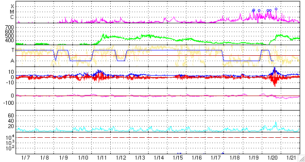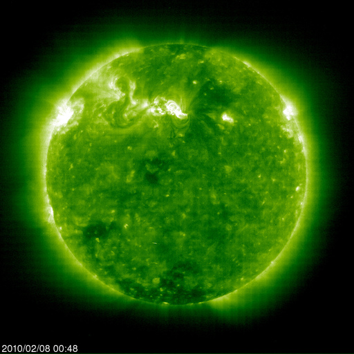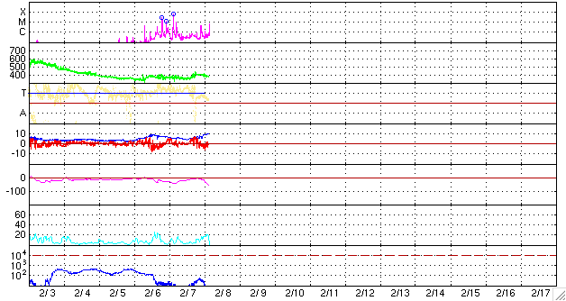 2010/ 2/ 8 13:36 更新 1045黒点群は大きくなり、小規模フレアを起こし続けています。CMEも発生しています。 担当 篠原 太陽のフレア活動は続いています。 昨日は、ニュースの時にM6.4の中規模フレアが発生しましたが、 その後も、C9.9、C4.2、C4.2、C1.0と小規模フレアが続き(NOAAのリスト)、 今日もまた、ニュースとともにC6.2、そしてC7.7とフレアが盛んに発生しています。 1045黒点群は、更に形を変え、大きな黒点が並ぶように見えています。 この大きさになると、眼の良い人であれば、直接見えるかもしれません。 日食メガネをとり出して、挑戦してみてはいかがでしょうか(私は見えませんでした)。 1045黒点群は、磁場構造も複雑で、エネルギーを蓄えていると考えられます。 今後も中規模フレアや、あるいはXクラスの大規模フレアを起こすかもしれません。 Xクラスが発生すれば、2006年12月以来となります。 また、太陽の東端からは、1046黒点群が上がってきました。 こちらも、EIT195では明るく見えていた領域で、 黒点は小さいですが、今後の活動が注目されます。 また、昨日のM6フレアによって、 CME(太陽ガスの放出現象)が発生しています(動画を掲載しています)。 太陽の中心付近で発生したため、地球に向かって飛び出しています。 LASCO C3では、太陽を囲むように広がるFull Halo CMEが観測されています。 太陽が静かだったので当たり前ですが、こんなCMEも久しぶりに見た気がします。 明日の夜くらいから明後日にかけて、到来が考えられます。 (こういう予想も久しぶりで、少しうろたえています) 引き続き、太陽の動きに注目してください。 一方、太陽風は、速度が400km/秒と平均的なレベルに上がり、 その後380km/秒で落ち着いています。 まだ高速風の到来という変化ではなく、太陽風の変化はこれからでしょう。 磁場強度を見ると、5nTからゆっくりと強まり、現在10nTを超えるほどに上がっています。 速度の上昇は近いのかもしれません。 太陽活動でかすんでしまいましたが、コロナホールは太陽の西側に進んでいます。 そろそろ影響がやってきても良い頃です。 ここまでの磁気圏活動は、静穏です。 現在、磁場強度が強まっているため、簡単に強い南向きになることがあります。 その場合、オーロラ活動が一気に活発化しますので、しばらく注意が必要です。 この後、速度も上昇を始めると、影響は一段と強まりやすくなります。 CMEの影響も重なって、今週はにぎやかな一週間になりそうです。 SOHO EIT195による、太陽コロナ。8日10時(世界時8日1時)。 (c) SOHO (ESA & NASA) ![]() SOHOによる太陽可視光写真。1045、1046黒点群が見えています。 (c) SOHO (ESA & NASA) ![]() SOHOによる磁場写真。1045黒点群付近の磁場は複雑です。 (c) SOHO (ESA & NASA) ![]() 太陽を囲むようにガスが広がっていくFull Halo CMEが観測されました。 (c) SOHO (ESA & NASA) ![]() GOES衛星の太陽X線データ (c) NOAA/SWPC ![]() ACEが観測した太陽風の磁場(1番上の枠、白線は全体の強度、赤線は南北成分) および、太陽風の密度(3番目の橙線)、速度(4番目の黄線) (c) NOAA/SWPC ![]() リアルタイムAE指数 下段のAEグラフの値が高くなると、オーロラ活動が活発化しています。 (c) 京都大学, NICT ![]() シベリアで観測された3日間の磁場データ 右側の3分の1が、昨日のデータになります。グラフが上がったり下がったりすると、オーロラ活動が活発化しています。 (c) NICT ![]() 27日の太陽周期に合わせたデータプロット 太陽が同じ面を地球に向けていた27日前の変化から、今後を予想することができます。 (c) NICT