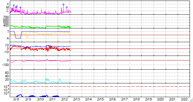 2010/ 2/13 12:30 更新 中規模フレアが2回発生し、太陽は活動がやや強まっています。太陽風は穏やかです。 担当 篠原 昨夜、12日20時(世界時12日11時)に、 1046黒点群(北半球の中央に見える黒点群)がM8.3の中規模フレアを起こしました。 短時間型の変化で、X線のグラフはたいへん尖った変化をしています。 1046黒点群は、その前にもC7.9のフレアを起こしていて、活動度を高めています。 今後も、中規模フレアを起こす可能性があるとのことです。 1045黒点群(北半球の西側(右側)に見える黒点群)も、 今日の未明、13日3時(世界時12日18時)にM1.1の中規模フレアを起こしています。 まだまだこちらもがんばっているようです。 SOHO EIT195では、東端の向こう側にも明るい領域が見えます。 今後は、この領域の活動も注目されます。 SOHOの磁場写真を見ると、太陽の北半球の西、中央、東に3つの磁場の強まりが見られます。 これらは、左が白(N極)、右が黒(S極)になっています(西の1045群は、二重になっているようです)。 これは第24活動周期の北半球の磁場の極性です。 一方、南半球にも磁場の強まりがひとつあります。 この極性も、左が白(N極)、右が黒(S極)になっています。 しかし、北半球と南半球では磁場の極性は逆になるので、 第24期の場合、左が黒、右が白になるのですが、この部分は逆を向いています。 これは、前の活動周期である第23期の性質が顔を出したのでしょうか。 詳しくは分かりませんが、気になる領域です。 太陽風は、速度340km/秒、磁場強度6nTで安定しています。 CMEの第二弾となる変化は特に見られませんでした。 昨日より、磁場の南北成分は、0nTからマイナス方向の南寄りで推移しています。 このため、小規模のオーロラ活動が断続的に発生しているようです。 最新の部分では、-5nTとまとまった南向きになっています。 これからしばらく、オーロラ活動がやや強まるかもしれません。 ただ、低速風なので、変動が大きくなることはないでしょう。 SOHO EIT195を見ると、南半球のコロナホールは西側に大きく迫り出しています。 ここからの影響がやがてやって来そうです。 前周期には見られなかった領域なので、到来のタイミング、影響の規模など注目してください。 SOHO EIT195による、太陽コロナ。13日8時(世界時12日23時)。 (c) SOHO (ESA & NASA) ![]() SOHOによる太陽の可視光写真。西に1045黒点群、中央に1046黒点群が見えています。 (c) SOHO (ESA & NASA) ![]() SOHOによる太陽の磁場。南半球の強まりに注目しています。 (c) SOHO (ESA & NASA) ![]() GOES衛星の太陽X線データ (c) NOAA/SWPC ![]() ACEが観測した太陽風の磁場(1番上の枠、白線は全体の強度、赤線は南北成分) および、太陽風の密度(3番目の橙線)、速度(4番目の黄線) (c) NOAA/SWPC ![]() リアルタイムAE指数 下段のAEグラフの値が高くなると、オーロラ活動が活発化しています。 (c) 京都大学, NICT ![]() シベリアで観測された3日間の磁場データ 右側の3分の1が、昨日のデータになります。グラフが上がったり下がったりすると、オーロラ活動が活発化しています。 (c) NICT ![]() 27日の太陽周期に合わせたデータプロット 太陽が同じ面を地球に向けていた27日前の変化から、今後を予想することができます。 (c) NICT