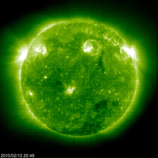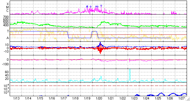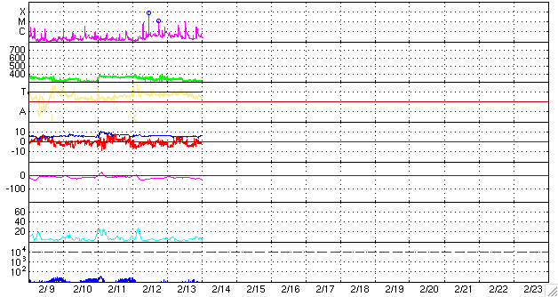 2010/ 2/14 10:34 更新 小規模フレアを起こしながら、1048黒点群が上がってきたようです。太陽風は低速が続いています。 担当 篠原 SOHOの可視光写真ではまだ見ることができませんが、 太陽の東端から新しく1048黒点群が上がってきたそうです。 SOHO EIT195を動画で見ると、この領域は活発な活動を起こしていて、 プロミネンスのループが美しく輝いています。 そして、姿を現す直前なのかと思われますが、C4.3、C9.6とふたつの小規模フレアを起こしています。 東端ぎりぎりでの発生ですから、実際の規模はこれよりも大きかったのではないでしょうか。 SOHOの可視光写真が更新されれば、1048群の黒点を見ることができるでしょう。 どのような黒点なのか、注目してください。 一方、1046黒点群は、CクラスやBクラスの小さなフレアを起こしている程度です。 規模は弱まっている様です。 太陽風は、速度が310km/秒に下がっています。 低速風の状態が続いています。 太陽の南半球にはコロナホール広がっていましたが、まだ影響は見られないまま経過しています。 27日周期の図では、前周期の1月20-21日に速度の山が発生しているので、 このタイミングにかけて変化が見られるのかもしれません。 また、この2日間に発生したフレアの影響が来るのかどうかなど、 明日、明後日にかけて、太陽風の変化にも注目してください。 太陽風の磁場強度は、5〜6nTと平均的な強さで推移しています。 南北成分が南寄りになっていて、小規模のオーロラ活動が発生しています。 この状態が続くと、今夜のアラスカのライブカメラなどが楽しみです。 SOHO EIT195による、太陽コロナ。14日6時(世界時13日21時)。 (c) SOHO (ESA & NASA) ![]() SOHOによる太陽の可視光写真。東端の1048黒点群は、この写真ではまだ見えないようです。 (c) SOHO (ESA & NASA) ![]() GOES衛星の太陽X線データ (c) NOAA/SWPC ![]() ACEが観測した太陽風の磁場(1番上の枠、白線は全体の強度、赤線は南北成分) および、太陽風の密度(3番目の橙線)、速度(4番目の黄線) (c) NOAA/SWPC ![]() リアルタイムAE指数 下段のAEグラフの値が高くなると、オーロラ活動が活発化しています。 (c) 京都大学, NICT ![]() シベリアで観測された3日間の磁場データ 右側の3分の1が、昨日のデータになります。グラフが上がったり下がったりすると、オーロラ活動が活発化しています。 (c) NICT ![]() 27日の太陽周期に合わせたデータプロット 太陽が同じ面を地球に向けていた27日前の変化から、今後を予想することができます。 (c) NICT