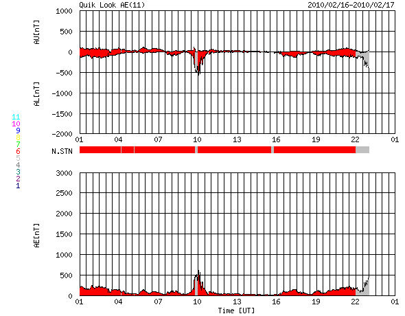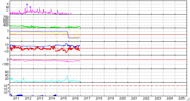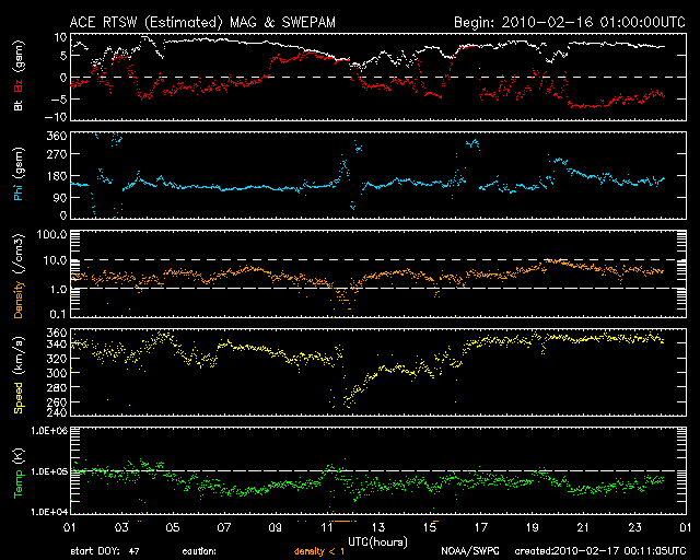 2010/ 2/17 09:06 更新 太陽風磁場の強まりは続いていますが、影響は弱まっています。 担当 篠原 CMEの影響で、10nTレベルに強まっていた太陽風の磁場強度は、 一時的に弱まったりしながらも、依然、8nTとやや強まった状態を保っています。 LASCO C3の動画を見ると、太陽では、14日から15日にかけても、 CMEの吹き出しが何度も見えています。 これらの影響など、もうしばらく太陽風の変動は続くかもしれません。 ただし、速度は350km/秒ほどと低速の状態です。 磁場の南北成分が南寄りに推移しているため、磁気圏活動は続いていますが、 規模は小規模に留まっています。 昨日のAE指数も、200nT前後の小さな変化はいくつも見えていますが、 まとまった変化は、500nTの高まりが1度見られた程度です。 シベリアの3日間の磁場変化を見ると、図の中央部の一昨日は大きく変化していますが、 右側の昨日の変化はだいぶ小さくなっています。 それでも、アラスカのライブカメラでは、昨夜もきれいなオーロラの動きが見えていました。 沖縄の磁場変化は、-50nTの減少まででした。 磁気嵐は、小規模の変化で落ち着いています。 太陽風の変化がどこまで続くか、 太陽のフレア活動が一段落しているので、太陽風の変化も終息の方向にありますが、 引き続きACEのデータやオーロラの活動に注目してください。 その太陽では、西側の1046黒点群、東側の1048黒点群、 どちらも小さくなり、写真の中でも存在感がなくっています。 X線の変化も、Bクラスの小さなフレアが1度起きただけです。 太陽も、一旦お休みというところでしょう。 SOHO EIT195による、太陽コロナ。17日8時(世界時16日23時)。 (c) SOHO (ESA & NASA) ![]() SOHOによる太陽の可視光写真。1046黒点群と1048黒点群は弱まっています。 (c) SOHO (ESA & NASA) ![]() ACEが観測した太陽風の磁場(1番上の枠、白線は全体の強度、赤線は南北成分) および、太陽風の密度(3番目の橙線)、速度(4番目の黄線) (c) NOAA/SWPC ![]() リアルタイムAE指数 下段のAEグラフの値が高くなると、オーロラ活動が活発化しています。 (c) 京都大学, NICT ![]() シベリアで観測された3日間の磁場データ 右側の3分の1が、昨日のデータになります。グラフが上がったり下がったりすると、オーロラ活動が活発化しています。 (c) NICT ![]() 沖縄の磁場擾乱 下へ下がるほど、擾乱が発達している事を意味します。 (c) NICT ![]() 27日の太陽周期に合わせたデータプロット 太陽が同じ面を地球に向けていた27日前の変化から、今後を予想することができます。 (c) NICT