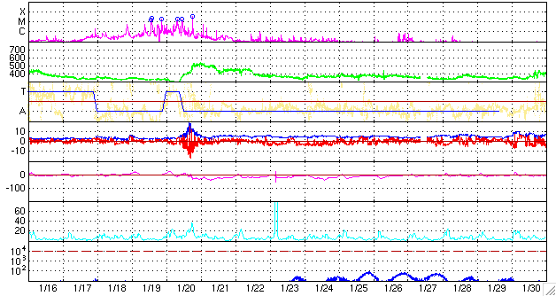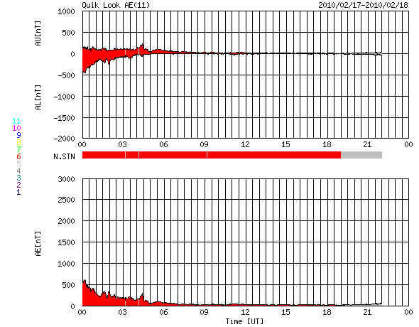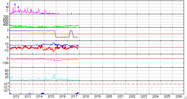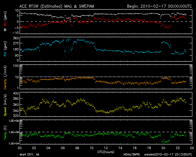 2010/ 2/18 08:06 更新 太陽風の変化は落ち着き、磁気圏も静かになっています。太陽の活動も穏やかです。 担当 篠原 太陽風の変化は、だいたい落ち着いた様です。 磁場強度は、まだ多少強めですが、7nT付近で安定しています。 南北成分も、南に偏るという傾向がなくなり、0nTを前後する様になっています。 速度は、340km/秒から380km/秒と少し上昇していますが、 平均レベルを下回るあたりでの変化です。 南向き磁場が終わるとともに、磁気圏も静かになっています。 AE指数は、初めに中規模の変化が見えていますが、以降はすっかり静穏です。 ここ数日にぎやかだった北極のオーロラの輝きも、一旦終息です。 太陽からの突発的な変動もなくなり、太陽風はしばらく穏やかな状態が続きそうです。 その太陽では、中央付近の南寄りに1049黒点群が発生しました。 SOHO EIT195で明るさを増していた領域です。 掲載の写真でも、5つくらい黒点が見えています。 北半球の1046群、1048群はどちらもかなりかすかになっていますが、まだ見えています。 太陽のフレア活動はすっかりおとなしくなって、 この1日間も、小さなBクラスのフレアが2つほど発生しただけです。 STEREO Behindで東端の向こう側をのぞいても、特に活動的な領域は見られません。 太陽はしばらく静かになりそうです。 SOHO EIT195による、太陽コロナ。18日7時半(世界時17日22時半)。 (c) SOHO (ESA & NASA) ![]() SOHOによる太陽の可視光写真。1049黒点群が新しく発生しています。 (c) SOHO (ESA & NASA) ![]() ACEが観測した太陽風の磁場(1番上の枠、白線は全体の強度、赤線は南北成分) および、太陽風の密度(3番目の橙線)、速度(4番目の黄線) (c) NOAA/SWPC ![]() リアルタイムAE指数 下段のAEグラフの値が高くなると、オーロラ活動が活発化しています。 (c) 京都大学, NICT ![]() シベリアで観測された3日間の磁場データ 右側の3分の1が、昨日のデータになります。グラフが上がったり下がったりすると、オーロラ活動が活発化しています。 (c) NICT ![]() 27日の太陽周期に合わせたデータプロット 太陽が同じ面を地球に向けていた27日前の変化から、今後を予想することができます。 (c) NICT