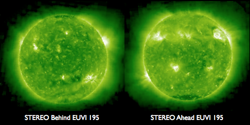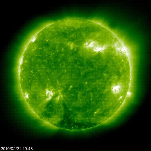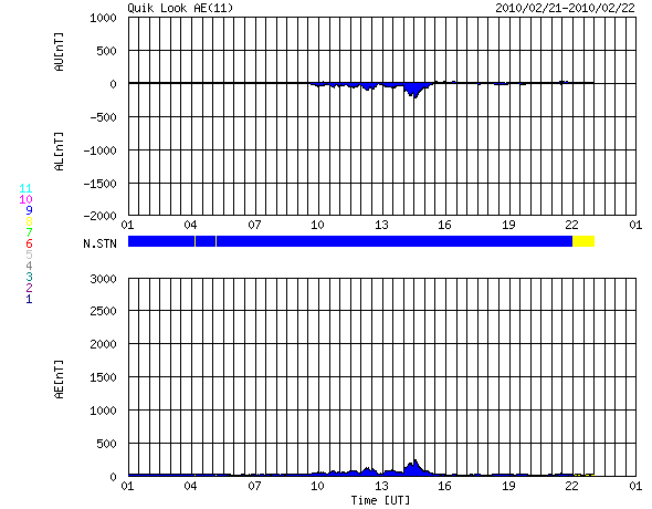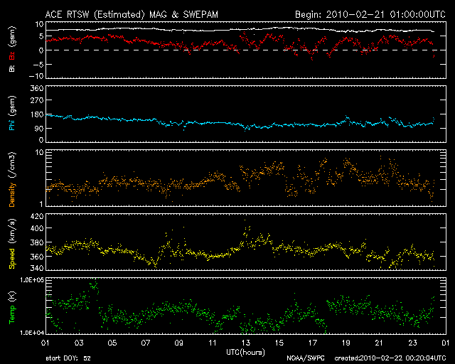 2010/ 2/22 09:20 更新 太陽風は穏やかで、磁気圏も静穏です。太陽も静かです。 担当 篠原 太陽風の速度は、370km/秒まで下がったところで落ち着いています。 磁場強度も6-7nTと若干強まった状態で安定していて、 太陽風のグラフはほとんど変化のない図になっています。 磁場の南北成分だけが、北寄り一辺倒だったのが、ちらちらと振動するようになって、 その影響で小さなオーロラ活動が発生しているようです。 AE指数の図の中ほどに、100〜200nTの小さな変化が見えます。 全体的には静かな状態です。 このまま4〜5日くらいは過ぎていくのではないでしょうか。 太陽も一休みが続いています。 活発だった領域が次第に太陽の向こう側に回り、 活動的な領域が少ない面がこちら側に広がってきています。 現在の太陽は、活動の表側と裏側があるかのように、活発な領域が一方に偏っています。 太陽の東西に広がってきた2機のSTEREO衛星で比較してみましょう。 今日の1枚目の写真を見てください。 左がBehind、右がAheadの同時刻の写真です。 これまで地球を向いていた面を見ているのがAheadです。 ここは、北半球側を中心に、明るい活動領域がずらっと並んでいます。 一方、これから地球に向かってくる面を見ているのはBehindです。 こちらも活動的な領域が無いわけではないのですが、 どれも規模は小さく、右の写真と比べると、全体的に穏やかな印象を受けます。 STEREOのページには、2枚の写真を使った平面図も掲載されています。 この衛星のお陰で、今は、太陽のほぼ全体を見渡すことができています。 2機のSTEREO衛星による、太陽の右側と左側の比較。2月22日3時(世界時21日18時) (c) NASA, 作図:宇宙天気ニュース ![]() SOHO EIT195による、太陽コロナ。22日5時(世界時21日20時)。 (c) SOHO (ESA & NASA) ![]() SOHOによる太陽の可視光写真。1049黒点群が見ています。 (c) SOHO (ESA & NASA) ![]() ACEが観測した太陽風の磁場(1番上の枠、白線は全体の強度、赤線は南北成分) および、太陽風の密度(3番目の橙線)、速度(4番目の黄線) (c) NOAA/SWPC ![]() リアルタイムAE指数 下段のAEグラフの値が高くなると、オーロラ活動が活発化しています。 (c) 京都大学, NICT ![]() シベリアで観測された3日間の磁場データ 右側の3分の1が、昨日のデータになります。グラフが上がったり下がったりすると、オーロラ活動が活発化しています。 (c) NICT ![]() 27日の太陽周期に合わせたデータプロット 太陽が同じ面を地球に向けていた27日前の変化から、今後を予想することができます。 (c) NICT