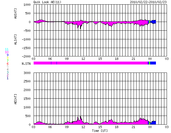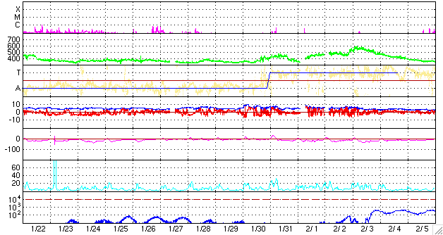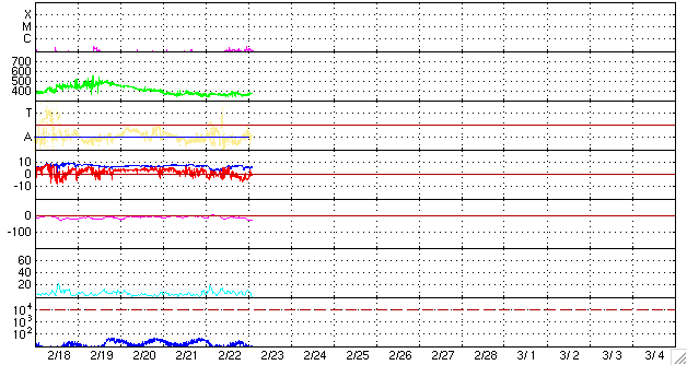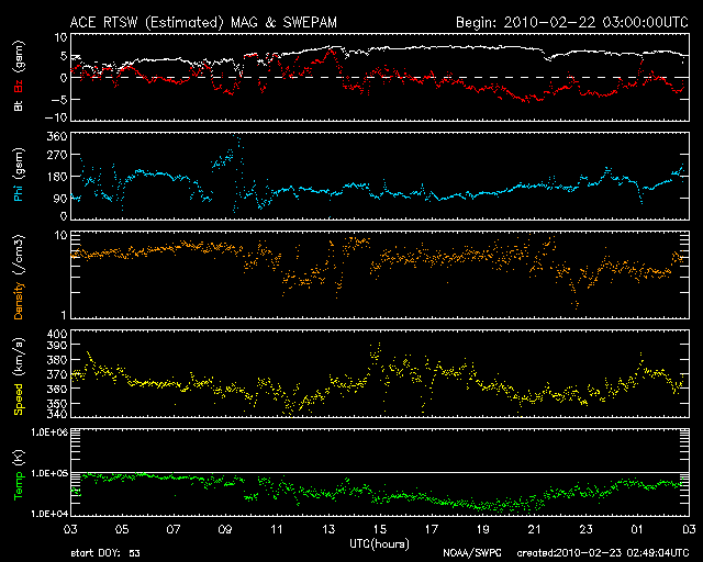 2010/ 2/23 11:49 更新 太陽風は穏やかですが、磁場が南を向いていて、小規模のオーロラ活動が続いています。 担当 篠原 太陽風は、磁場強度5〜6nT、速度350〜380km/秒と、 落ち着いた状態で小さく変化をしています。 磁場の南北成分が南寄りの傾向に変わっていて、 小規模ですが磁気圏に影響を及ぼしています。 AE指数を見ると、300nT前後の変動が長い時間観測されています。 太陽風は、この後も概ね低速の状態が続くと思われます。 磁場強度も平均的なレベルなので、このまま南寄りの傾向が続いても、 現状程度の小さなオーロラ活動が続くだけでしょう。 磁場が北寄りに切り替われば、磁気圏は穏やかになります。 太陽は穏やかです。 1049黒点群は静かに西の端に近づいています。 この黒点群が没して、太陽は一旦無黒点になるのか、 その前に新しい黒点群が現われるでしょうか。 今のところ、今月はずっと黒点が見えています。 このまま月末まで黒点が見え続ければ、2007年1月以来3年ぶりです。 (2月なので、2〜3日有利ですが) 黒点のある状態がどこまで続くか、注目してみてください。 SOHO EIT195による、太陽コロナ。23日7時半(世界時22日22時半)。 (c) SOHO (ESA & NASA) ![]() SOHOによる太陽の可視光写真。南西の端近くに1049黒点群があります。 (c) SOHO (ESA & NASA) ![]() ACEが観測した太陽風の磁場(1番上の枠、白線は全体の強度、赤線は南北成分) および、太陽風の密度(3番目の橙線)、速度(4番目の黄線) (c) NOAA/SWPC ![]() リアルタイムAE指数 下段のAEグラフの値が高くなると、オーロラ活動が活発化しています。 (c) 京都大学, NICT ![]() シベリアで観測された3日間の磁場データ 右側の3分の1が、昨日のデータになります。グラフが上がったり下がったりすると、オーロラ活動が活発化しています。 (c) NICT ![]() 27日の太陽周期に合わせたデータプロット 太陽が同じ面を地球に向けていた27日前の変化から、今後を予想することができます。 (c) NICT