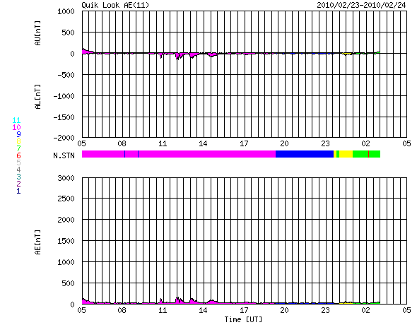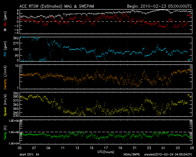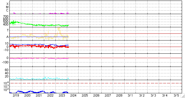 2010/ 2/24 13:57 更新 太陽風はやや低速で、磁気圏は静かです。1050黒点群が出現しました。 担当 篠原 太陽風は、340〜380km/秒とやや低速の状態で安定しています。 磁場強度は、2nTから5nTに増えていますが、こちらも平均的なレベルです。 太陽風は、このまま穏やかに推移しそうです。 磁気圏も静穏です。 AE指数はほとんど変化していません。 ACEの最新のところで、磁場が南寄りになっています。 もし、この傾向が続くと、オーロラ活動がやや強まると思われます。 オーロラ観望には注目です。 (ただし、最後はまた北向きになっています) 太陽では、中心付近に1050黒点群が出現しました。 EIT195で、やや明るく光っていた領域に発生しています。 X線には、Bクラスの小さな変化が見えていますが、 これは西の端の1049黒点群が作った変化だとのことです。 SOHO EIT195による、太陽コロナ。24日8時半(世界時23日23時半)。 (c) SOHO (ESA & NASA) ![]() SOHOによる太陽の可視光写真。 (c) SOHO (ESA & NASA) ![]() ACEが観測した太陽風の磁場(1番上の枠、白線は全体の強度、赤線は南北成分) および、太陽風の密度(3番目の橙線)、速度(4番目の黄線) (c) NOAA/SWPC ![]() リアルタイムAE指数 下段のAEグラフの値が高くなると、オーロラ活動が活発化しています。 (c) 京都大学, NICT ![]() シベリアで観測された3日間の磁場データ 右側の3分の1が、昨日のデータになります。グラフが上がったり下がったりすると、オーロラ活動が活発化しています。 (c) NICT ![]() 27日の太陽周期に合わせたデータプロット 太陽が同じ面を地球に向けていた27日前の変化から、今後を予想することができます。 (c) NICT