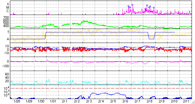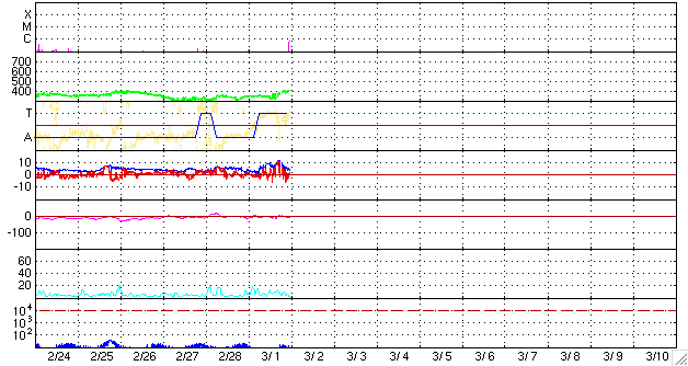 2010/ 3/ 2 09:16 更新 太陽風の速度が400km/秒に上がっています。黒点群が2つ新しく出現しています。 担当 篠原 昨日のニュースの後、太陽風磁場のセクターが再び切り替わりました。 前の記事で紹介したように、1日ほど間をおいての再反転となっています。 (セクターの様子は、27日周期の図を見てください。) それとともに、太陽風の変化が始まっています。 磁場強度は4nTから10nTに強まり、速度は350km/秒から400km/秒に上昇しています。 ただし、上がり幅は小さく、速度は平均的なレベルに戻った程度です。 そして、磁場強度は既に5nTに下がっています。 この変化がコロナホールの影響の中心部なのか、それに先立つ変化なのか、 27日周期の図を見ると、前周期もだらだらと速度の変化などが見られていたので、 もうしばらく様子を見る必要がありそうです。 前周期の最高速度は、今日くらいに回帰するタイミングで起きています。 太陽風の磁場が強まりましたが、南北成分は比較的北寄りに推移していたようです。 このため、オーロラ活動は小さなものが発生した程度です。 現在は、速度は回復していますが、磁場強度が落ちてしまったので、 現状では、あまり活発なオーロラは期待できないようです。 太陽は、少しにぎやかになっています。 1052、1053と2つの黒点群が、中央から南西側に発生しました。 昨日の太陽は、1051黒点群1つだけと心もとない印象でしたが、 それを追いかけるようにすぐ次の黒点群が発生しました。 太陽活動が高まっていることを感じます。 昨日の可視光写真で指摘した中央部の黒い点は、エラーデータの様です。 今日も同じ場所に止まっています。 うっかり黒点に見間違えないように、気をつけてください。 X線のグラフを見ると、つい先ほど、Bクラスの小さなフレアが発生したようです。 発生したのは、東端に見えている領域です。 実際には、もう少し大きな現象のようです。 SOHO EIT195による、太陽コロナ。2日4時(世界時1日19時)。 (c) SOHO (ESA & NASA) ![]() SOHOによる太陽の可視光写真。1051、1052、1053と3つの黒点群があります。 (c) SOHO (ESA & NASA) ![]() ACEが観測した太陽風の磁場(1番上の枠、白線は全体の強度、赤線は南北成分) および、太陽風の密度(3番目の橙線)、速度(4番目の黄線) (c) NOAA/SWPC ![]() リアルタイムAE指数 下段のAEグラフの値が高くなると、オーロラ活動が活発化しています。 (c) 京都大学, NICT ![]() シベリアで観測された3日間の磁場データ 右側の3分の1が、昨日のデータになります。グラフが上がったり下がったりすると、オーロラ活動が活発化しています。 (c) NICT ![]() 27日の太陽周期に合わせたデータプロット 太陽が同じ面を地球に向けていた27日前の変化から、今後を予想することができます。 (c) NICT