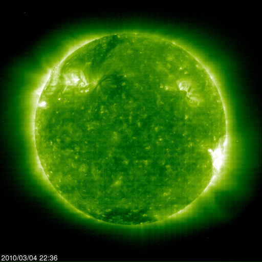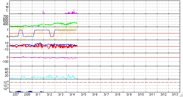 2010/ 3/ 5 08:47 更新 1052黒点群が活発化し、C2の小規模フレアを起こしました。 担当 篠原 太陽の南西(右下)にある1052黒点群(南西の2つの黒点群の上の方)が、活動度を増し、 C2.2の小規模フレアや、前後してBクラスの小さなフレアを多数起こしています。 X線の強度も上昇していて、SOHO EIT195では昨日よりもより光って見えています。 この後、1052黒点群は太陽の向こう側に回ってしまいます。 それとともに、地球への影響は無くなります。 以降の活動は、STEREO Ahead衛星で見ることができるでしょう。 昨日のニュースの頃は、300km/秒台後半に下がっていた太陽風の速度は、 その後再び上昇に転じ、460km/秒と一昨日よりも(少しですが)高速な風になりました。 現在は420km/秒と平均レベルに戻りつつあります。 27日周期の図で前周期の変化と比較すると、 速度が高まる領域の到来がずいぶん遅くなりました。 今回、見えていたコロナホールは大きさも小さく、 やって来る太陽風の様子はなかなか読みにくい状況でした。 極域では、AE指数で200〜400nTほどの小規模のオーロラ活動が2回ほど発生しています。 太陽風磁場が南向きになっていた時間帯に対応しています。 この後、太陽風の速度は次第に低下していくでしょう。 基本的には、これからの太陽風は、低速の穏やかな状態が続くと思われます。 SOHO EIT195による太陽コロナ。5日7時半(世界時4日22時半)。 (c) SOHO (ESA & NASA) ![]() SOHOによる太陽可視光写真。 (c) SOHO (ESA & NASA) ![]() GOES衛星の太陽X線データ (c) NOAA/SWPC ![]() ACEが観測した太陽風の磁場(1番上の枠、白線は全体の強度、赤線は南北成分) および、太陽風の密度(3番目の橙線)、速度(4番目の黄線) (c) NOAA/SWPC ![]() リアルタイムAE指数 下段のAEグラフの値が高くなると、オーロラ活動が活発化しています。 (c) 京都大学, NICT ![]() シベリアで観測された3日間の磁場データ 右側の3分の1が、昨日のデータになります。グラフが上がったり下がったりすると、オーロラ活動が活発化しています。 (c) NICT ![]() 27日の太陽周期に合わせたデータプロット 太陽が同じ面を地球に向けていた27日前の変化から、今後を予想することができます。 (c) NICT