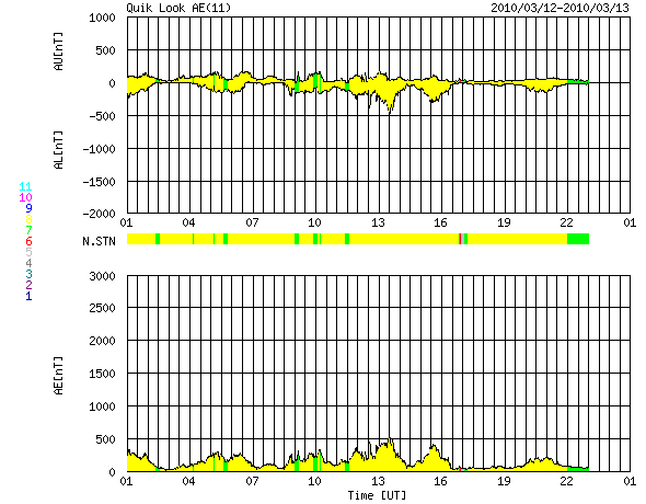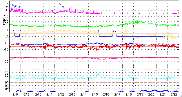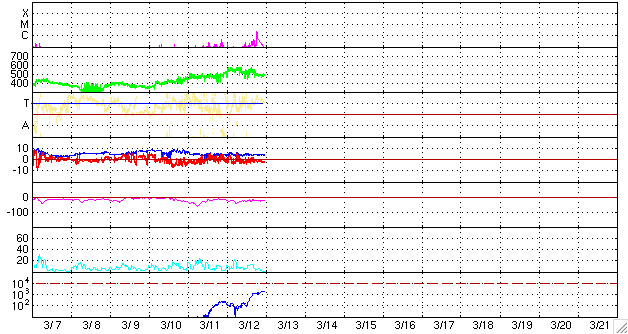 GOES衛星の太陽X線データ (c) NOAA/SWPC ![]() ACEが観測した太陽風の磁場(1番上の枠、白線は全体の強度、赤線は南北成分) および、太陽風の密度(3番目の橙線)、速度(4番目の黄線) (c) NOAA/SWPC ![]() リアルタイムAE指数 下段のAEグラフの値が高くなると、オーロラ活動が活発化しています。 (c) 京都大学, NICT ![]() シベリアで観測された3日間の磁場データ 右側の3分の1が、昨日のデータになります。グラフが上がったり下がったりすると、オーロラ活動が活発化しています。 (c) NICT ![]() 27日の太陽周期に合わせたデータプロット 太陽が同じ面を地球に向けていた27日前の変化から、今後を予想することができます。 (c) NICT