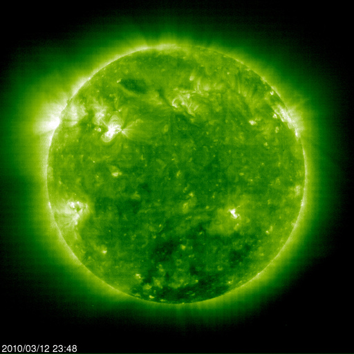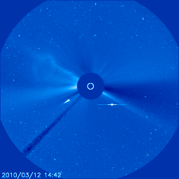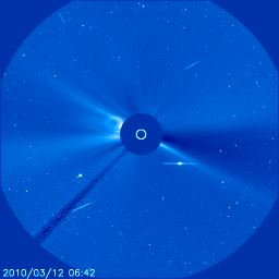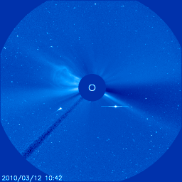 2010/ 3/13 09:03 更新 1054黒点群が発達し、Cクラスの小規模フレアを起こしています。500km/秒付近の高速太陽風が続いています。 担当 篠原 1054黒点群が、ぐっと大きさを増しています。 今日の未明、13日3時(世界時12日18時)には、C2.3の小規模フレアを起こしました。 活動度を増しているようで、今後もCクラスの小規模フレアや、 Mクラスの中規模フレアを起こす可能性があります。 黒点の発達の様子も含めて、引き続き注目してください。 一方、南半球に見えていた1955黒点群は、ほとんど見えなくなっています。 また、SOHO LASCO C3によると、CME(太陽ガスの放出現象)が、太陽の東側で発生しています。 LASCO C3の写真を掲載しますが、昨日の彗星も最後の姿を見せています。 フィラメントの噴出によるものだそうですが、 太陽の活動が活発化して、こういったCMEも頻繁に見られるようになりました。 太陽風は、昨日いっぱい、520〜560km/秒の高速風が続きました。 今朝になって(世界時12日16時くらいから)、480km/秒と一段下がっています。 それでも、まだ高速の状態です。 一方、磁場強度は4〜5nTでほぼ一定です。 弱い南向きの傾向がずっと続いていて、 その影響で小規模のオーロラ活動もずっと続いています。 AE指数を見ると、昨日いっぱい300〜500nTの変動が発生していました。 今朝になると、太陽風の速度が下がった影響か、AE指数の変化も200nTほどに弱まっています。 この高速風が太陽の南半球に広く見えるコロナホールの影響だと考えると、 太陽風が強まった状態は、もうしばらく続きそうです。 SOHO EIT195を見ると、コロナホールの最後の部分(左側の領域)がやっと太陽の中心線に来ています。 このあたりの影響は、3〜4日後くらいにやって来ます。 磁場の南寄りの傾向も続くとすると、 もうしばらく太陽風速度の高まりとオーロラ活動に注意が必要でしょう。 また、放射線帯の高エネルギー電子が、1000のレベルに達しています。 ここまで増加したのは、昨年の7月以来です(この時は、ぎりぎりで1000に達した程度です)。 更に強まって、10000の警戒レベルに達すると、一昨年、2008年10月以来となり、 本当に久しぶりの上昇になります。 こちらも注目です。 SOHO EIT195による太陽コロナ。13日9時(世界時13日0時)。 (c) SOHO (ESA & NASA) ![]() SOHOによる太陽可視光写真。 (c) SOHO (ESA & NASA) ![]() SOHO衛星のLASCO C3カメラの映像 (c) SOHO (ESA & NASA)