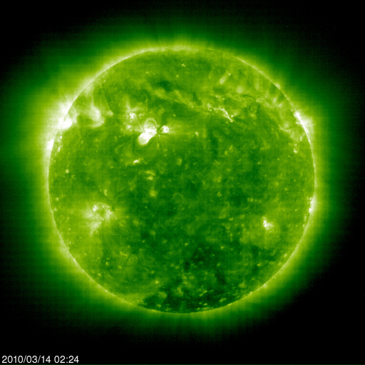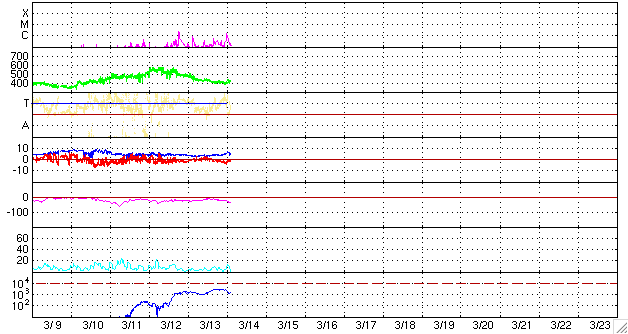 2010/ 3/14 12:03 更新 太陽で小規模のフレアが起きています。太陽風は平均的な速度に下がっています。 担当 篠原 1054黒点群は、B9、C1.5と規模は小さいですが、フレア活動を続けています。 目立った発達は止まったようですが、黒点の姿も大きく、 今後も小規模、あるいは中規模のフレアを起こす可能性があります。 SOHO EIT195の太陽コロナを見ると、1054黒点群に続くように、 北半球の中緯度域の東端から明るい活動領域がどんどん上がってきています。 しかし、可視光写真を見ると白斑が見えるだけで、黒点にはなっていません。 STEREO Behindによると、活動領域の出現はもうしばらく続きます。 どんな領域がやって来るか、ここにも注目してください。 太陽風は、速度が420km/秒ほどに下がり、平均的な風速になっています。 磁場強度は、5nTと平均的な強さを保っています。 磁気圏のオーロラ活動はだいぶ静かになっています。 AE指数の図で、前半が全く変化していないのは、 太陽風磁場の南北成分がやや北寄りになったためです。 図の後半になると、磁場は弱い南向きになったのですが、 速度が下がったこともあり、AE指数の変化は小さいものばかりです。 太陽の南半球にあるコロナホールは、ちょうど太陽の中心線を通過したくらいで、 もうしばらく地球への影響の可能性があります。 もう2〜3日ほどは速度上昇(大きく上がることはありませんが)の可能性があります。 放射線帯の高エネルギー電子は、3000ほどで上昇が止まっています。 現在の磁気圏活動の様子から考えると、これ以上上がることはないでしょう。 今回は、警戒レベルへの到達はありませんでした。 SOHO EIT195による太陽コロナ。14日11時半(世界時14日2時半)。 (c) SOHO (ESA & NASA) ![]() SOHOによる太陽可視光写真。 (c) SOHO (ESA & NASA) ![]() GOES衛星の太陽X線データ (c) NOAA/SWPC ![]() ACEが観測した太陽風の磁場(1番上の枠、白線は全体の強度、赤線は南北成分) および、太陽風の密度(3番目の橙線)、速度(4番目の黄線) (c) NOAA/SWPC ![]() リアルタイムAE指数 下段のAEグラフの値が高くなると、オーロラ活動が活発化しています。 (c) 京都大学, NICT ![]() シベリアで観測された3日間の磁場データ 右側の3分の1が、昨日のデータになります。グラフが上がったり下がったりすると、オーロラ活動が活発化しています。 (c) NICT ![]() 27日の太陽周期に合わせたデータプロット 太陽が同じ面を地球に向けていた27日前の変化から、今後を予想することができます。 (c) NICT