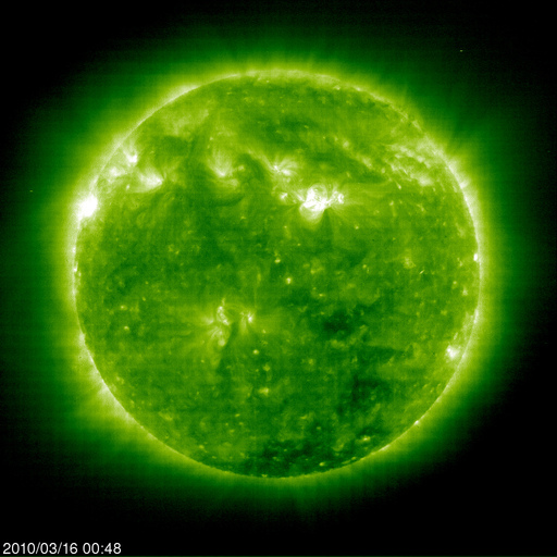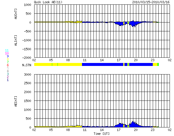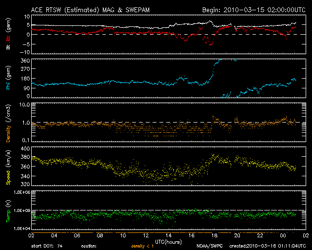 2010/ 3/16 10:06 更新 太陽風はやや低速で、磁気圏も穏やかです。1054黒点群は弱まりつつあります。 担当 篠原 太陽風は、速度が380〜360km/秒とやや低速で安定しています。 磁場強度も多少の変化はありますが、5nT付近でこちらも安定しています。 磁気圏のオーロラ活動も静穏で、AE指数は小規模の変化が一時的に発生した程度です。 太陽の南半球に見えているコロナホールの影響は、 現在は特に及んでいないと言えます。 今日のSOHO EIT195では、コロナホールの最後の部分が西半球の半分ほどにかかっています。 この部分は低緯度側に細長く伸びていて、 今日、明日くらいにこの領域の影響がやってくるかもしれません。 大きな速度上昇にはならないと思いますが、もうしばらく注目してください。 放射線帯の高エネルギー電子は、やや高めのままですが、 現時点ではこれから警戒レベルに増えることはないでしょう。 太陽には1054黒点群が見えていますが、勢力は弱まり始めたようです。 可視光写真を昨日の写真と比べると、黒点の面積が小さくなり、 形も大きな黒点がぽつんと目立つだけになっています。 X線グラフも、変化が弱まっている印象です。 まだ、Cクラスのフレアを起こす可能性はありますが、活動としては弱まっていくでしょう。 SOHO EIT195による太陽コロナ。16日10時(世界時16日1時)。 (c) SOHO (ESA & NASA) ![]() SOHOによる太陽可視光写真。1054黒点群はやや小さくなっています。 (c) SOHO (ESA & NASA) ![]() ACEが観測した太陽風の磁場(1番上の枠、白線は全体の強度、赤線は南北成分) および、太陽風の密度(3番目の橙線)、速度(4番目の黄線) (c) NOAA/SWPC ![]() リアルタイムAE指数 下段のAEグラフの値が高くなると、オーロラ活動が活発化しています。 (c) 京都大学, NICT ![]() シベリアで観測された3日間の磁場データ 右側の3分の1が、昨日のデータになります。グラフが上がったり下がったりすると、オーロラ活動が活発化しています。 (c) NICT ![]() 27日の太陽周期に合わせたデータプロット 太陽が同じ面を地球に向けていた27日前の変化から、今後を予想することができます。 (c) NICT