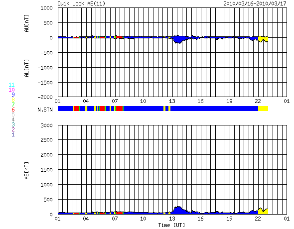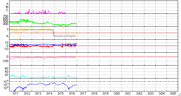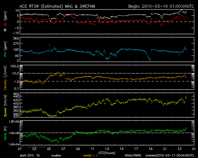 2010/ 3/17 09:04 更新 太陽風の速度がやや上がっています。コロナホールの影響が来ているようです。 担当 篠原 太陽風の速度は、420km/秒と平均的な速度に上がっています。 密度も小幅ですが増えていて、コロナホールの影響が来ているのではないでしょうか。 磁場強度は、6nT付近でずっと安定していましたが、 今朝になって8nTくらいに強まりの傾向を示しています。 この後、速度がもう一段上昇するかもしれません。 SOHO EIT195を見ると、コロナホール自体はもう西側に大きく回っています。 地球への影響は、それほど長くは続かないでしょう。 更に速度が上がっても、影響は明日、明後日くらいまでと思われます。 磁気圏のオーロラ活動は、穏やかです。 太陽風磁場の南北成分が、北寄りに推移しているためです。 この傾向が続く間は、磁気圏も静かな状態が続きます。 太陽風の速度や磁場強度が高まっている間に、磁場が南寄りに切り替わると、 オーロラの活動も強まってきますので注目してください。 太陽の1054黒点群は、昨日よりも更に小さくなっています。 X線の強度も下がっていて、太陽の活動は穏やかです。 SOHO EIT195による太陽コロナ。17日9時(世界時17日0時)。 (c) SOHO (ESA & NASA) ![]() SOHOによる太陽可視光写真。1054黒点群は更に小さくなっています。 (c) SOHO (ESA & NASA) ![]() ACEが観測した太陽風の磁場(1番上の枠、白線は全体の強度、赤線は南北成分) および、太陽風の密度(3番目の橙線)、速度(4番目の黄線) (c) NOAA/SWPC ![]() リアルタイムAE指数 下段のAEグラフの値が高くなると、オーロラ活動が活発化しています。 (c) 京都大学, NICT ![]() シベリアで観測された3日間の磁場データ 右側の3分の1が、昨日のデータになります。グラフが上がったり下がったりすると、オーロラ活動が活発化しています。 (c) NICT ![]() 27日の太陽周期に合わせたデータプロット 太陽が同じ面を地球に向けていた27日前の変化から、今後を予想することができます。 (c) NICT