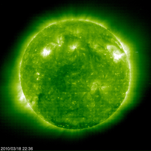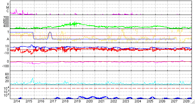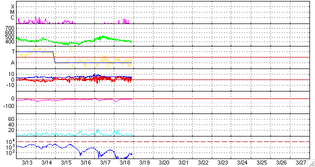 2010/ 3/19 08:33 更新 Bクラスの小さなフレアが起きています。太陽風はゆっくりと低速風に変わりつつあります。 担当 篠原 太陽の黒点は、1054、1056黒点群ともに昨日よりも小さくなっていて、 このまま消えてしまいそうです。 一方、X線のグラフでは、Bクラスの小さなフレアが何度も発生しています。 SOHOやSTEREOの動画を調べると、この2つの黒点群がちかちかと活動している様です。 黒点としては縮小しましたが、活動度はやや上がっているようです。 この後も、Cクラスに達するくらいのフレアが発生するかもしれません。 活動度が更に強まる傾向なのか、弱まっていくのか、変化の傾向に注目してください。 太陽風はゆっくりと速度を下げ、400km/秒を割りつつあるところです。 やや高速の状態は昨日で終わり、これから低速風に変わりそうです。 太陽風の磁場強度も、5nT付近を保っていますが、わずかに減少の傾向が見られます。 昨日のニュースの後、磁場の南北成分は再び北寄りに変わり、 このため、磁気圏の活動もそれ以降は静かになっています。 オーロラの活動度を示すAE指数は、初めに変化が見えるだけで、以降は平坦です。 この後は、太陽風は低速になり、オーロラ活動も静かな状態が続くでしょう。 この1週間ほど久しぶりに増加していた放射線帯の高エネルギー電子も、 3日連続で減少を続けています。 しかし、太陽の活動が高まってきた状況で、 今後は増加を目にする機会も増えるでしょう。 SOHO EIT195による太陽コロナ。19日7時半(世界時18日22時半)。 (c) SOHO (ESA & NASA) ![]() SOHOによる太陽可視光写真。1054黒点群(右)、1056黒点群(左)ともに小さくなっています。 (c) SOHO (ESA & NASA) ![]() GOES衛星の太陽X線データ (c) NOAA/SWPC ![]() ACEが観測した太陽風の磁場(1番上の枠、白線は全体の強度、赤線は南北成分) および、太陽風の密度(3番目の橙線)、速度(4番目の黄線) (c) NOAA/SWPC ![]() リアルタイムAE指数 下段のAEグラフの値が高くなると、オーロラ活動が活発化しています。 (c) 京都大学, NICT ![]() シベリアで観測された3日間の磁場データ 右側の3分の1が、昨日のデータになります。グラフが上がったり下がったりすると、オーロラ活動が活発化しています。 (c) NICT ![]() 27日の太陽周期に合わせたデータプロット 太陽が同じ面を地球に向けていた27日前の変化から、今後を予想することができます。 (c) NICT