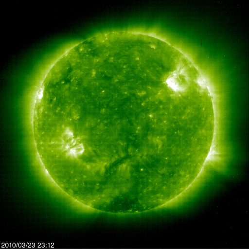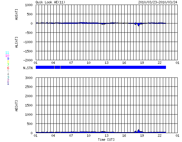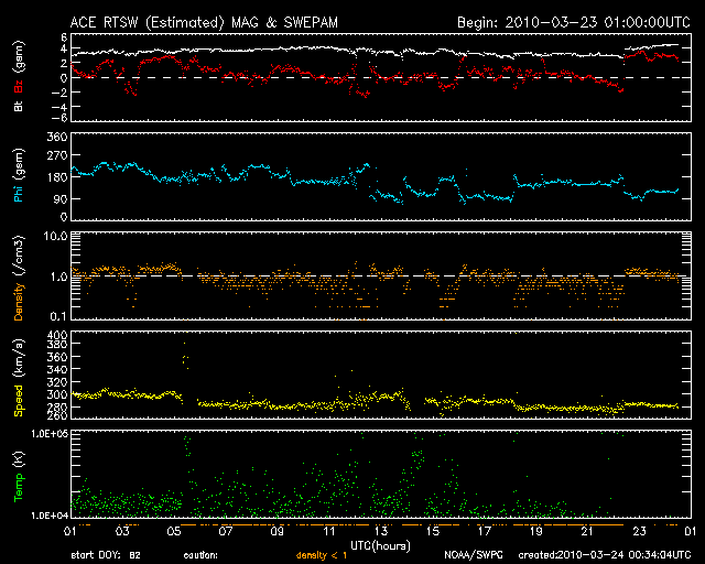 2010/ 3/24 09:34 更新 280km/秒とかなり遅い太陽風になっています。1057黒点群が現れました。 担当 篠原 太陽風の速度は、もう一段下がって280km/秒とかなり遅くなっています。 ここまでしっかり下がるのは、1月初め以来と言ってもよく、ちょっと久しぶりです。 昨年などは、日常的にこのくらいまで下がっていたのですが、 それと比べると、太陽風にも太陽活動の変化の影響が現れているのでしょう。 磁気圏も静穏です。 AE指数はほとんど変化していません。 SOHO EIT195の太陽コロナを見ると、 昨日の写真で見えていた南半球側の弱いコロナホールは、 今日の写真では、角度の関係でもう見にくくなっています。 この規模だと、あまり目立った影響は来ないのではないでしょうか。 その他は、活動領域の明るい光はあちこちにありますが、 コロナホールは見られず、太陽風は当分穏やかに推移しそうです。 太陽では、東端から新しい黒点群が上がってきました。 1057黒点群と番号が付いています。 EIT195の動画を見ると、なかなか活発に活動しているようで、 既にB6の小さなフレアも起こしています。 この後、Cクラス程度のフレアを起こすかもしれません。 SOHO EIT195による太陽コロナ。24日8時(世界時23日23時)。 (c) SOHO (ESA & NASA) ![]() SOHOによる太陽可視光写真。1057黒点群が現れました。 (c) SOHO (ESA & NASA) ![]() ACEが観測した太陽風の磁場(1番上の枠、白線は全体の強度、赤線は南北成分) および、太陽風の密度(3番目の橙線)、速度(4番目の黄線) (c) NOAA/SWPC ![]() リアルタイムAE指数 下段のAEグラフの値が高くなると、オーロラ活動が活発化しています。 (c) 京都大学, NICT ![]() シベリアで観測された3日間の磁場データ 右側の3分の1が、昨日のデータになります。グラフが上がったり下がったりすると、オーロラ活動が活発化しています。 (c) NICT ![]() 27日の太陽周期に合わせたデータプロット 太陽が同じ面を地球に向けていた27日前の変化から、今後を予想することができます。 (c) NICT