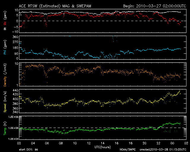2010/ 3/26 08:53 コロナホールの影響で、太陽風の速度は400km/秒台に上がっています。