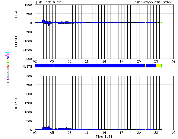 下段のAEグラフの値が高くなると、オーロラ活動が活発化しています。