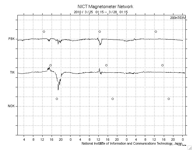 右側の3分の1が、昨日のデータになります。グラフが上がったり下がったりすると、オーロラ活動が活発化しています。