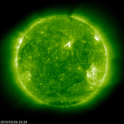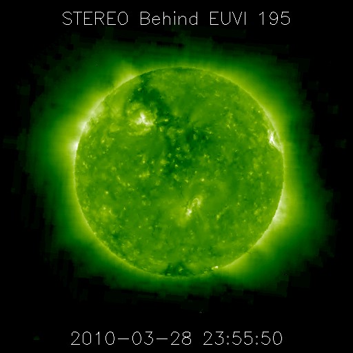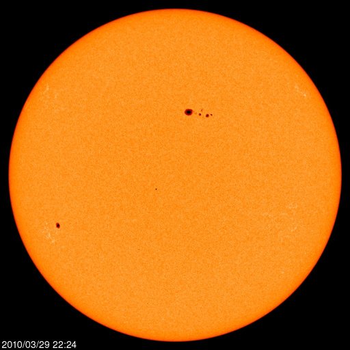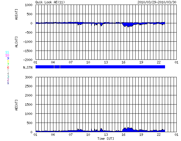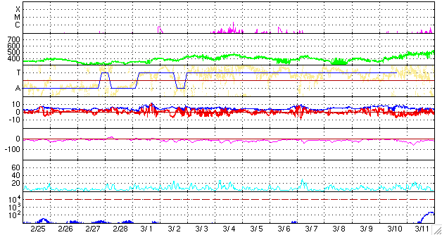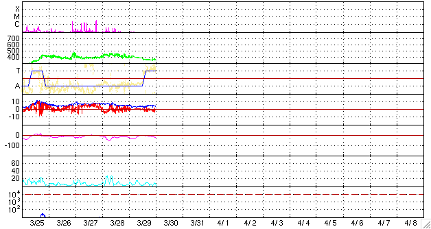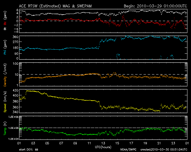 2010/ 3/30 09:52 更新 1057黒点群が小さくなっているようです。太陽風は低速風になっています。 担当 篠原 1057黒点群は、西側(右側)の黒点が小さく、砕けたようになってしまいました。 小さな黒点がずらっと並んで、なかなかきれいな写真です。 X線のグラフは穏やかで、強度も次第に下がっていることから、 黒点群の活動度は次第に弱まっているようです。 南東(左下)の1059群は変化なく、黒点ひとつのままです。 太陽風は、次第に速度が下がり、360km/秒の低速風になっています。 ACEの図を見ると、前半はどのグラフも直線的ですが、 中央付近で、がくんと数値が変化し、以降はぎざぎざと小さな変動を伴っています。 ちょうどこの境目で、太陽風磁場のセクター境界を越えています。 それに伴って、太陽風の様子が変化しているのでしょう。 磁気圏は概ね静穏です。 セクター境界以降、太陽風の磁場がやや南寄りの傾向をとっています。 このため、AE指数の図の後半で、小規模の変化が目立っています。 SOHO EIT195の太陽コロナの東端付近に、縦に細長くコロナホールが見えています。 STEREO Behindを参照すると(3枚目の写真)、 赤道付近から北極にかけて、比較的濃く、しっかりと広がりが見えています。 今回は、しっかりとした高速風がやって来るかもしれません。 10日くらい先のことになるでしょう。 SOHO EIT195による太陽コロナ。30日8時半(世界時29日23時半)。 (c) SOHO (ESA & NASA) ![]() SOHOによる太陽可視光写真。 (c) SOHO (ESA & NASA) ![]() STEREO Behindによる太陽コロナ。29日9時(世界時29日0時)。北半球の中央部にコロナホールが広がっています。 (c) NASA ![]() GOES衛星の太陽X線データ (c) NOAA/SWPC ![]() ACEが観測した太陽風の磁場(1番上の枠、白線は全体の強度、赤線は南北成分) および、太陽風の密度(3番目の橙線)、速度(4番目の黄線) (c) NOAA/SWPC ![]() リアルタイムAE指数 下段のAEグラフの値が高くなると、オーロラ活動が活発化しています。 (c) 京都大学, NICT ![]() シベリアで観測された3日間の磁場データ 右側の3分の1が、昨日のデータになります。グラフが上がったり下がったりすると、オーロラ活動が活発化しています。 (c) NICT ![]() 27日の太陽周期に合わせたデータプロット 太陽が同じ面を地球に向けていた27日前の変化から、今後を予想することができます。 (c) NICT