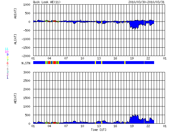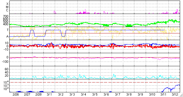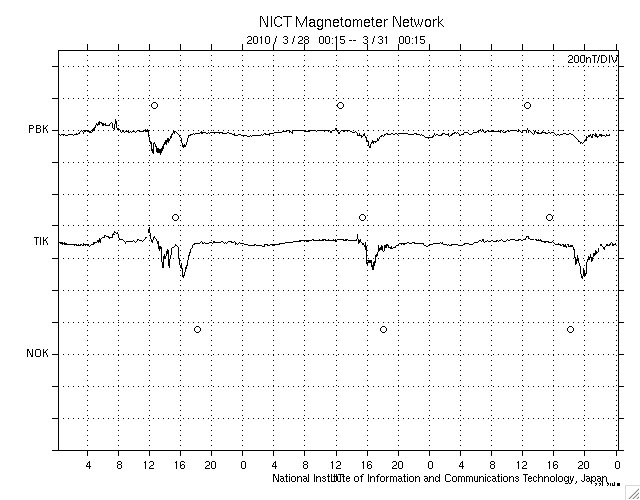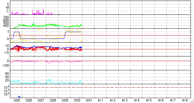 GOES衛星の太陽X線データ (c) NOAA/SWPC ![]() ACEが観測した太陽風の磁場(1番上の枠、白線は全体の強度、赤線は南北成分) および、太陽風の密度(3番目の橙線)、速度(4番目の黄線) (c) NOAA/SWPC ![]() リアルタイムAE指数 下段のAEグラフの値が高くなると、オーロラ活動が活発化しています。 (c) 京都大学, NICT ![]() シベリアで観測された3日間の磁場データ 右側の3分の1が、昨日のデータになります。グラフが上がったり下がったりすると、オーロラ活動が活発化しています。 (c) NICT ![]() 27日の太陽周期に合わせたデータプロット 太陽が同じ面を地球に向けていた27日前の変化から、今後を予想することができます。 (c) NICT