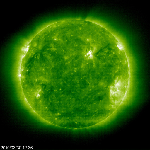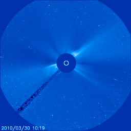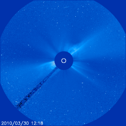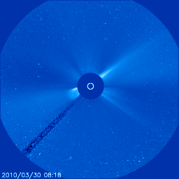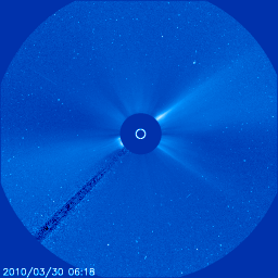 2010/ 3/31 09:20 更新 CMEが2方向に発生しています。太陽風は400km/秒前後で穏やかです。 担当 篠原 SOHO LASCOの観測によると、30日15時(世界時30日6時)くらいから、 太陽の南東(左下)と北西(右上)の2方向に向かって、 ほぼ同時にCME(太陽ガスの放出現象)が発生したようです。 STEREOの写真と見比べると、左下のCMEは手前側、右上のCMEは向こう側へ噴出しているようです。 原因となる現象は、はっきりとは見つけられなかったのですが、 左下のCMEに対応して、1059黒点群(南東に見える黒点)で弱い爆発的な現象が起きていた様です。 弱いCMEが斜め方向に飛び出しているので、地球への影響はほとんどなさそうです。 また、この後、SOHO EIT195の北半球東端に明るく見えている領域でも、 31日3時(世界時30日18時)頃に爆発的な現象が発生しています。 これによるCMEが、これからLASCOカメラに見えてくるのではないかと思われます。 注目してください。 1057、1059黒点群は、どちらも活動度は低く、 X線のグラフは全く変動していません。 太陽は、基本的には穏やかな状態が続いています。 太陽風は、380〜420km/秒と平均的な速度で安定した状態が続いています。 ACEの図では、速度が変化しているように見えますが、変化の幅は小さなものです。 磁場強度も5nT付近で安定しています。 このままの状態が続きそうです。 磁気圏では、小さな規模の変動が続いています。 太陽風磁場の南北成分が、0nTから若干南向きに推移しているためでしょう。 掲載の図の後半に入って、少し南向きが強まり、AE指数の変化も少し大きくなっています。 オーロラ活動もこの様な状態が続きそうです。 掲載のSOHO EIT195は、昨日の写真から半日後くらいの写真で、 東端のコロナホールの位置はあまり動いて見えません。 今後の注目点は、このコロナホールの規模の確認と、地球への影響でしょう。 SOHO EIT195による太陽コロナ。30日21時半(世界時30日12時半)。 (c) SOHO (ESA & NASA) ![]() SOHOによる太陽可視光写真。右上、1057黒点群。左下1059黒点群。 (c) SOHO (ESA & NASA) ![]() SOHO衛星のLASCO C3カメラの映像 (c) SOHO (ESA & NASA)