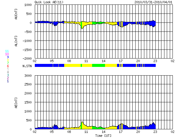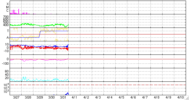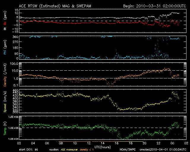 2010/ 4/ 1 10:01 更新 太陽風の磁場が強まっています。小規模のオーロラ活動が続いています。太陽は静穏です。 担当 篠原 本日より、swnews.jp という新しいアドレスからニュースを発信することになりました。 どうぞこれからもよろしくお願い致します。 今朝に入って、太陽風磁場が強まりを見せています。 昨日から5nTと平均的な強度が続いていましたが、現在10nTに強まっています。 やや先立ってプラズマ密度も高まっています。 4〜5日ほど前に、1057黒点群などの太陽活動によって作られた太陽風の変動が、 流れてやって来たのではないでしょうか。 速度も、一時的に330km/秒まで下がったものが、再び420km/秒ほどに上がっています。 しかし、太陽風の変化としては、これ以上大きくは乱れないのではないかと思います。 昨日より、磁場の南北成分がずっと南向きで推移していて、 この影響がオーロラ活動に現れています。 AE指数を見ると、規模は小さいものの、連続的に変動が観測されています。 現在は磁場強度が強まっていることから、 まとまった南向きになると、中規模のオーロラ活動くらいは発生しそうです。 月の具合がよくありませんが、ライブカメラなどの観望としてはチャンスでしょう。 今回の太陽風の変動は、それほど長くは続かないでしょう。 明日以降は、再び穏やかな状態に戻るのではないかと思います。 SOHO EIT195では、東端のコロナホールが少しずつ中央部に近づいています。 次第に姿が見やすくなっています。 次のまとまった変動は、このコロナホールによるものとなるでしょう。 太陽では、1057黒点群の右側の黒点たちがほとんど見えなくなり、 左側のひとつだけが目立つようになっています。 こうなると活動は低調で、南東の1059黒点群とともに、X線のグラフは静穏です。 SOHO EIT195による太陽コロナ。4月1日5時半(世界時31日20時半)。 (c) SOHO (ESA & NASA) ![]() SOHOによる太陽可視光写真。右上、1057黒点群。左下1059黒点群。 (c) SOHO (ESA & NASA) ![]() ACEが観測した太陽風の磁場(1番上の枠、白線は全体の強度、赤線は南北成分) および、太陽風の密度(3番目の橙線)、速度(4番目の黄線) (c) NOAA/SWPC ![]() リアルタイムAE指数 下段のAEグラフの値が高くなると、オーロラ活動が活発化しています。 (c) 京都大学, NICT ![]() 27日の太陽周期に合わせたデータプロット 太陽が同じ面を地球に向けていた27日前の変化から、今後を予想することができます。 (c) NICT