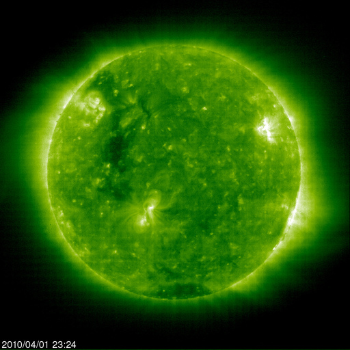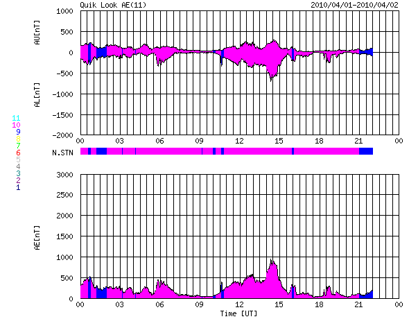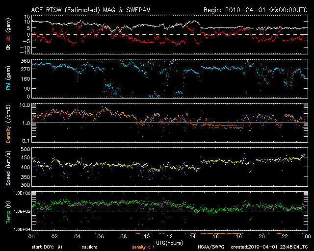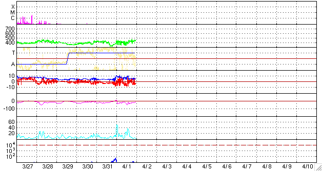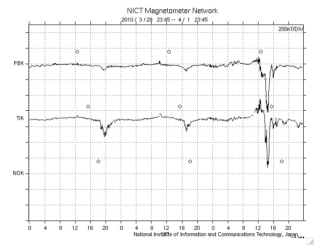 2010/ 4/ 2 08:49 更新 太陽風磁場南向きの影響で、オーロラ活動がやや活発に続いています。 担当 篠原 昨日から今日にかけて、やや活発なオーロラ活動が続いています。 AE指数では、300nTから900nTくらいまでの小中規模の変動が、 ずっと観測されています。 昨日、太陽風の磁場強度が10nTくらいに強まっていましたが、 南北成分も、-5nTくらいのまとまった南を向く時間が長く続いたためです。 太陽風の速度は、400〜450km/秒と平均的なレベルで、特に上がっていた訳ではありません。 オーロラ活動の強まりが小中規模に留まっていたのは、このためでしょう。 現在の太陽風は、速度は450km/秒と若干上がっていますが、 磁場強度は5nTと普通の強さに戻っています。 南寄りの傾向は続いている様で、引き続き小規模のオーロラ活動は期待できそうです。 しかし、太陽風磁場の強まりという変化はこれで落ち着き、 この後は、基本的には穏やかな太陽風になるでしょう。 SOHO EIT195では、東半球を縦に伸びるコロナホールの姿が、はっきりと見えてきました。 赤道付近から北半球の高緯度に向かって、黒い筋がしっかりと伸びています。 この様子だと、ある程度まとまった高速風がやってきそうです。 太陽の中心線に達するまでに2日ほどと見込むと、 高速風の始まりは、5〜6日後くらいでしょうか。 太陽は静穏です。 X線のグラフにはフレアの変化は見られず、全体の強度も次第に下がっています。 可視光写真は、カラーバランスが少しおかしくなっていますが、 1057黒点群(右側)の横には、白斑が見えています。 SOHO EIT195による太陽コロナ。2日8時半(世界時1日23時半)。 (c) SOHO (ESA & NASA) ![]() SOHOによる太陽可視光写真。右上、1057黒点群。左下1059黒点群。 (c) SOHO (ESA & NASA) ![]() ACEが観測した太陽風の磁場(1番上の枠、白線は全体の強度、赤線は南北成分) および、太陽風の密度(3番目の橙線)、速度(4番目の黄線) (c) NOAA/SWPC ![]() リアルタイムAE指数 下段のAEグラフの値が高くなると、オーロラ活動が活発化しています。 (c) 京都大学, NICT ![]() シベリアで観測された3日間の磁場データ 右側の3分の1が、昨日のデータになります。グラフが上がったり下がったりすると、オーロラ活動が活発化しています。 (c) NICT ![]() 27日の太陽周期に合わせたデータプロット 太陽が同じ面を地球に向けていた27日前の変化から、今後を予想することができます。 (c) NICT
