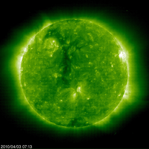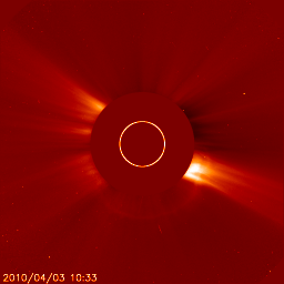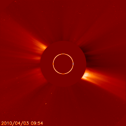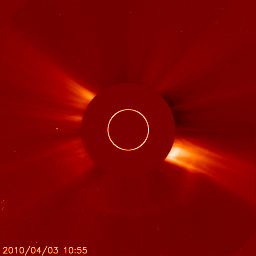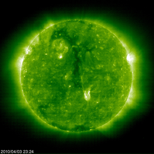 2010/ 4/ 4 08:43 更新 太陽でB7の小さなフレアが発生し、弱いCMEが地球方向に発生しています。 担当 篠原 3日19時(世界時3日10時)に、1059黒点群(太陽中心部南寄りの黒点)で、 B7.4と小さな規模のフレアが発生しました(動画を掲載)。 X線の変化が数時間にわたって続くタイプのフレアで、 これに伴って、CME(太陽ガスの放出現象)が発生しています。 SOHO LASCO C2の連続写真を掲載します。 フレアが小さいためにCMEの規模も小さく、ガスが淡くて見にくいのですが、 特に太陽の南側(下側)へ、太陽を包むように広がるハロー型のCMEが見えています。 発生地点が太陽の中心付近であることから、 噴き出したガスは地球の方向にも向かっていると思われます。 このため、4月6〜7日くらいに太陽風の乱れがやってきそうです。 フレアの規模から考えると、それほど大きな乱れにはならないでしょう。 このフレアを起こした1059黒点群は、特に発達しているわけではありません。 太陽は基本的には静穏でしょう。 また、SOHO EIT195では、太陽の北半球を北極から赤道付近まで、 縦にコロナホールが伸びています。 こちらもちょうど太陽の中心線に来ていることから、3〜4日後くらいに影響がやってきそうです。 すると、4月6日以降は、CMEとコロナホールの影響が重なって発生しそうです。 現在の太陽風は、速度が500〜550km/秒と昨日から高まったままで、 高速風が続いています。 27日周期の図を見ると、前周期にはこの様な変化は起きていません。 磁場強度も6nTの状態が続いています。 この太陽風の高まりはどこまで続くでしょうか。 また、昨夜くらいから、磁場の南北成分は南向きの傾向になっています。 このため、地球では小規模のオーロラ活動が発生しています。 現在の太陽風の様子では、この活動もしばらく続きそうです。 そして、放射線帯の高エネルギー電子も、1000くらいまで増加しています。 高速風が続いているので、引き続き上昇する可能性があります。 久しぶりに10,000の警戒レベルまで上がるかもしれません。 1059黒点群で発生したB7のフレア。SOHO EIT195より。 (c) SOHO (ESA & NASA)、宇宙天気ニュース(動画加工) ![]() SOHO EIT195による太陽コロナ。4日8時半(世界時3日23時半)。 (c) SOHO (ESA & NASA) ![]() SOHOによる太陽可視光写真。1057黒点群、1059黒点群が見えます。 (c) SOHO (ESA & NASA) ![]() SOHO衛星のLASCO C2カメラの映像 (c) SOHO (ESA & NASA)