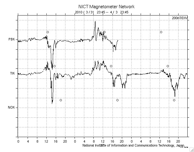 GOES衛星の太陽X線データ (c) NOAA/SWPC ![]() ACEが観測した太陽風の磁場(1番上の枠、白線は全体の強度、赤線は南北成分) および、太陽風の密度(3番目の橙線)、速度(4番目の黄線) (c) NOAA/SWPC ![]() リアルタイムAE指数 下段のAEグラフの値が高くなると、オーロラ活動が活発化しています。 (c) 京都大学, NICT ![]() シベリアで観測された3日間の磁場データ 右側の3分の1が、昨日のデータになります。グラフが上がったり下がったりすると、オーロラ活動が活発化しています。 (c) NICT ![]() 27日の太陽周期に合わせたデータプロット 太陽が同じ面を地球に向けていた27日前の変化から、今後を予想することができます。 (c) NICT
