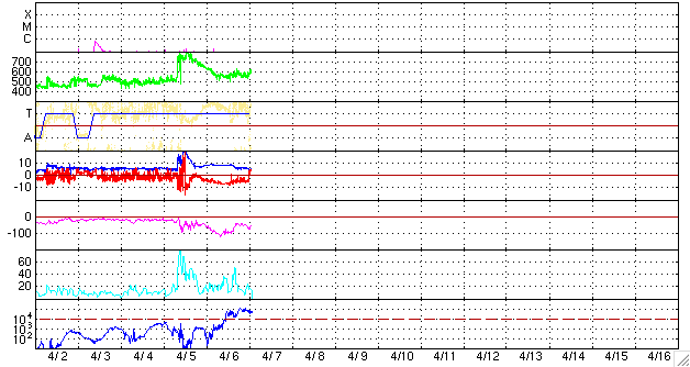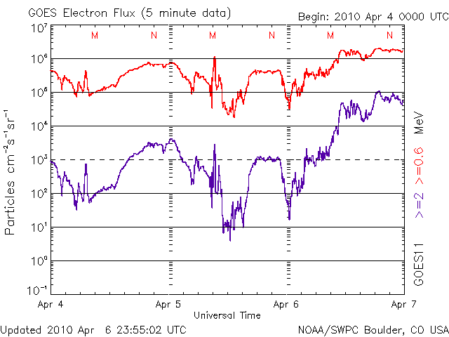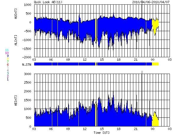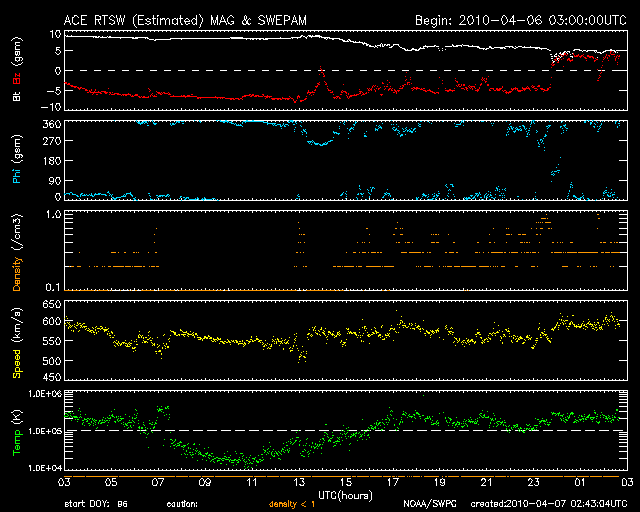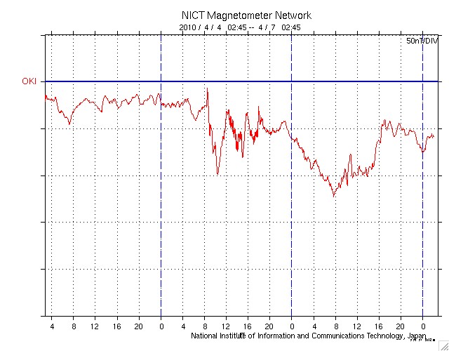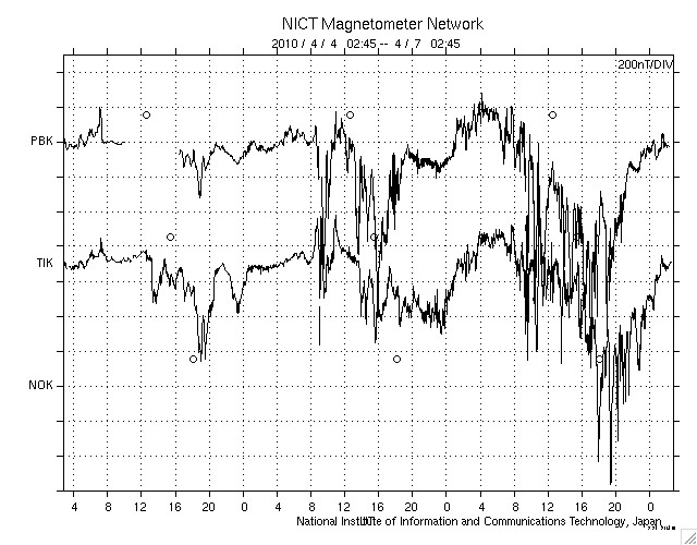 2010/ 4/ 7 11:44 更新 太陽風磁場が長時間南を向き、活発な磁気圏活動が発生しました。放射線帯がかなり強まっています。 担当 篠原 昨夜も速報を書きましたが、太陽風は高速、南向きを続け、 磁気圏も活発な状態が続きました。 ACEのグラフを見ると、太陽風の速度は570km/秒で安定し、高速状態が続いています。 磁場強度は、昨日いっぱいは8nTほどありましたが、 今日に入って次第に弱まり、現在は5nTに下がっています。 この間、特徴的な変化を示したのが太陽風磁場の南北成分です。 -5nTを越えるレベルの強い南向きがずっと、今朝まで続いていたのです。 この影響で、磁気圏にまとまった規模のエネルギーが連続的に流れ込み、 AE指数はずっと太くなったままという、特徴的な変化をしています。 これは、オーロラ活動の強まりはもちろんですが、 磁気圏の対流がかなり強まっていたと考えられます。 磁気嵐ももう一段強まっていて、 沖縄磁場データでは-100nT近い減少を記録しています。 これは地方時効果で少し強めに出ていて、 世界規模のデータによるDst指数では、-60nTくらいの減少の様です。 これは、規模としては小さな磁気嵐です。 現在の太陽風は、速度は600km/秒弱と高いレベルにありますが、 今朝から磁場が北向きに切り替わっていて、磁気圏活動は一旦落ち着いています。 このまま北を向き続けるか、あるいは、再び南向きに変わって磁気圏の活動を強めるか、 注目してください。 この後は、コロナホールの影響による高速風が2〜3日ほど続くかもしれません。 ただし、直前が派手だったので、地味な高速風に感じられそうです。 今回の磁気嵐で、放射線帯の高エネルギー電子も一気に増加しています。 警戒ラインをもう一段越え、100,000にまで達しました。 ここまで増加したのは、2008年3月以来、2年ぶりのことです。 かなり高いレベルになっていますので、衛星の運用などでは注意が必要でしょう。 太陽は穏やかです。 新しく現れた1060、1061黒点群は、規模に変化はなく、 X線データも目立った変化は見られません。 SOHO EIT195による太陽コロナ。7日11時半(世界時7日2時半)。 (c) SOHO (ESA & NASA) ![]() SOHOによる太陽可視光写真。 (c) SOHO (ESA & NASA) ![]() ACEが観測した太陽風の磁場(1番上の枠、白線は全体の強度、赤線は南北成分) および、太陽風の密度(3番目の橙線)、速度(4番目の黄線) (c) NOAA/SWPC ![]() リアルタイムAE指数 下段のAEグラフの値が高くなると、オーロラ活動が活発化しています。 (c) 京都大学, NICT ![]() 沖縄の磁場擾乱 下へ下がるほど、擾乱が発達している事を意味します。 (c) NICT ![]() シベリアで観測された3日間の磁場データ 右側の3分の1が、昨日のデータになります。グラフが上がったり下がったりすると、オーロラ活動が活発化しています。 (c) NICT ![]() 27日の太陽周期に合わせたデータプロット 太陽が同じ面を地球に向けていた27日前の変化から、今後を予想することができます。 (c) NICT
