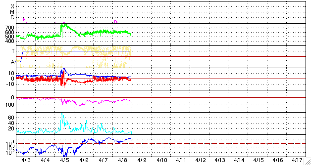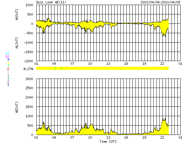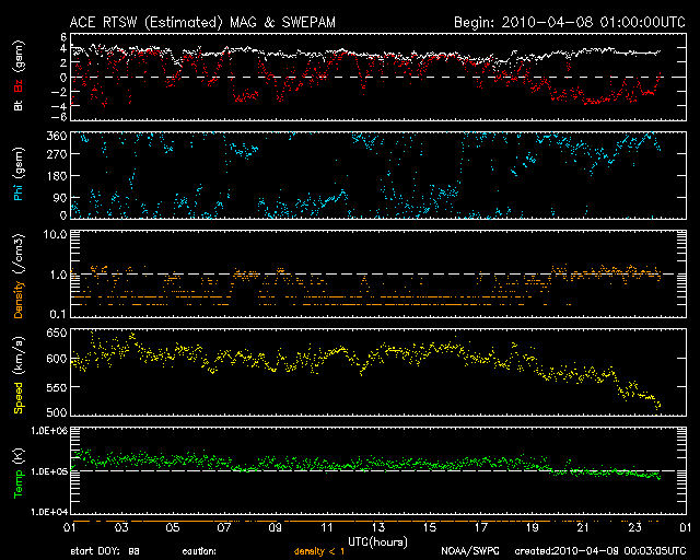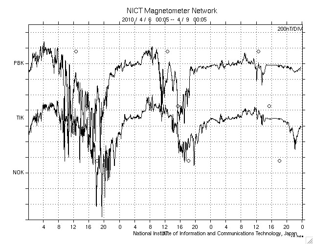 2010/ 4/ 9 09:03 更新 太陽風の速度は540km/秒へ下がってきています。小規模のオーロラ活動が続いています。 担当 篠原 昨日いっぱい、太陽風の速度は600km/秒を保ちました。 今日に入った頃から(世界時8日16時頃)低下が始まり、現在、540km/秒まで下がっています。 磁場強度も少しずつ弱まっていて、3nTくらいに下がっています。 太陽風の乱れも、終わりが近づいているようです。 昨日からのオーロラ活動は、600〜800nTの中規模の変動が3回ほど発生しています。 十分にぎやかな変動なのですが、 この3日間の荒れ具合を見ていると、穏やかになってきたなと感じてしまいます。 まだ高速風は続いていますので、今日、明日くらいまでは、 規模は小さくなりますがオーロラを楽しめそうです。 放射線帯高エネルギー電子は、今日も100,000に達しています。 活動が収まって、今後は減少に向かうため、明日には100,000を割る可能性がありますが、 その後、警戒レベルの10,000を割るまでは時間がかかるので、しばらく注意が必要でしょう。 太陽では、東側(左側)の1060黒点群は見えなくなり、西側(右側)の1061黒点群だけになっています。 しかし、消えたほうの1060黒点群で、昨日、8日12時(世界時8日3時)に、 B3.7の小さなフレアが発生しました。 今回も長時間継続するタイプのフレアで、 かなり淡いCMEが、地球の方向に向かって噴き出しています。 11〜12日頃に、このCMEによる太陽風の乱れがやって来ると予想されます。 SOHO EIT195による太陽コロナ。9日5時半(世界時8日20時半)。 (c) SOHO (ESA & NASA) ![]() SOHOによる太陽可視光写真。 (c) SOHO (ESA & NASA) ![]() ACEが観測した太陽風の磁場(1番上の枠、白線は全体の強度、赤線は南北成分) および、太陽風の密度(3番目の橙線)、速度(4番目の黄線) (c) NOAA/SWPC ![]() リアルタイムAE指数 下段のAEグラフの値が高くなると、オーロラ活動が活発化しています。 (c) 京都大学, NICT ![]() シベリアで観測された3日間の磁場データ 右側の3分の1が、昨日のデータになります。グラフが上がったり下がったりすると、オーロラ活動が活発化しています。 (c) NICT ![]() 27日の太陽周期に合わせたデータプロット 太陽が同じ面を地球に向けていた27日前の変化から、今後を予想することができます。 (c) NICT