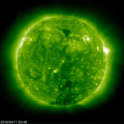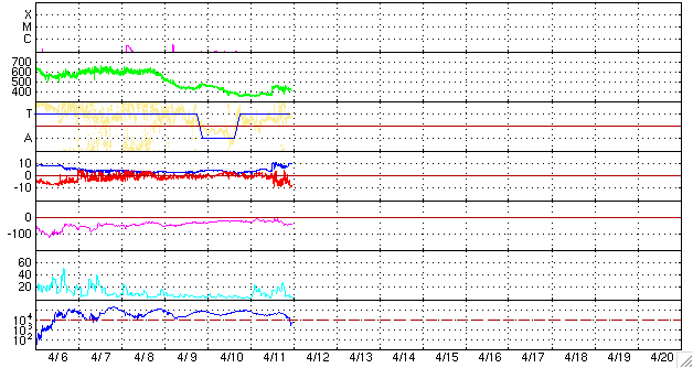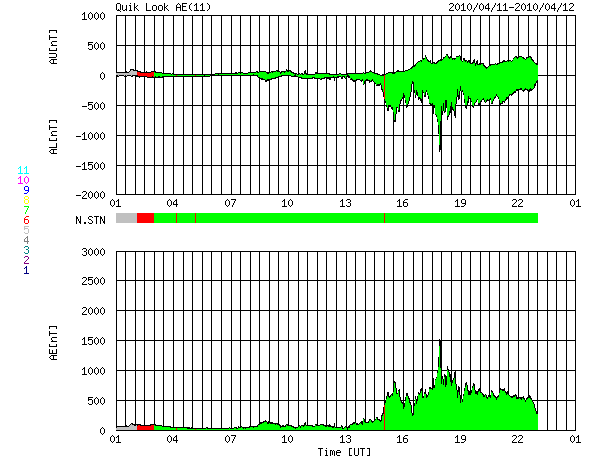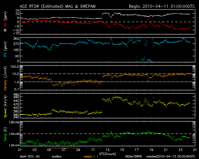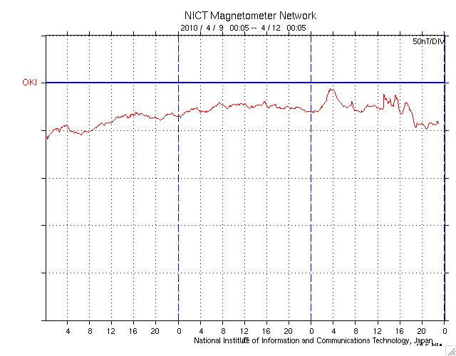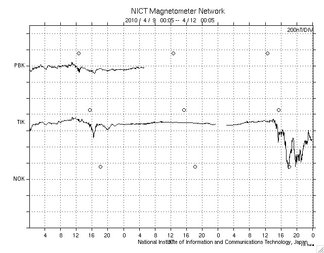 2010/ 4/12 09:21 更新 太陽風の擾乱がやって来ました。磁場南向きの影響で、磁気圏活動が強まっています。 担当 篠原 昨夜、11日22時(世界時11日13時)に、8日のCMEによる太陽風の擾乱が地球へやってきました。 太陽風は、磁場強度が10nTに強まり、プラズマ密度は1個/cm^3から10個/cm^3へ増加し、 速度は360km/秒から450km/秒へ高まりました。 速度の変化は小幅で、太陽風の乱れとしては小規模の様です。 27日周期の図で、前回の変化(図では半分見えなくなっていますが)と比べると、 ずっと小さな変動であることが分かります。 ただし、磁場の南北成分は今回も南向きに偏っていて、磁気圏への影響は効果的になっています。 到来直後の昨夜は、-5nT程の南向きが続き、 今朝になってもう一段強まって、-9nTほどの強い南向きになっています。 このため、磁気圏活動はなかなか強まっています。 AE指数は、600〜1000nTの中規模の変動が続き、 瞬間的に1500nTに達する激しい変化も記録されています。 グラフの変化が連続的に太くなっているのは、 まとまった南向きの磁場が連続的にやってきた時の特徴で、 磁気圏内部の対流が強まっていると考えられます。 (前回の激しい擾乱の時も、この様な変化が見られました) 一方、沖縄磁場データを見ると、 11日22時(世界時11日13時)に、 太陽風の圧力の強まりによる磁場強度の急な増加が観測されています。 その後、磁気嵐が始まって、-40nTほどの減少を示しています。 同様の変化は世界規模でも観測されており(京大WDC Dst指数)、 小規模の磁気嵐が始まっています。 ACEの最新データを見ると、南向き磁場は、-10nT近くに強まっています。 この影響で、磁気圏の活動はもう一段強まる可能性があります。 CMEの規模から考えて、太陽風の乱れはそれほど長くは続かないでしょう。 今日いっぱいか、明日には弱まっていると思います。 今回の擾乱の影響を受けて、 放射線帯の高エネルギー電子は、大きく数を減らしています。 一気に警戒レベルの10,000を割り込んでいます。 活動が一段落した後にどの程度の強度になるか、今後の変化に注目してください。 太陽は無黒点で、静穏です。 SOHO EIT195による太陽コロナ。12日9時(世界時12日0時)。 (c) SOHO (ESA & NASA) ![]() SOHOによる太陽可視光写真。無黒点です。 (c) SOHO (ESA & NASA) ![]() ACEが観測した太陽風の磁場(1番上の枠、白線は全体の強度、赤線は南北成分) および、太陽風の密度(3番目の橙線)、速度(4番目の黄線) (c) NOAA/SWPC ![]() リアルタイムAE指数 下段のAEグラフの値が高くなると、オーロラ活動が活発化しています。 (c) 京都大学, NICT ![]() シベリアで観測された3日間の磁場データ 右側の3分の1が、昨日のデータになります。グラフが上がったり下がったりすると、オーロラ活動が活発化しています。 (c) NICT ![]() 沖縄の磁場擾乱 下へ下がるほど、擾乱が発達している事を意味します。 (c) NICT ![]() 27日の太陽周期に合わせたデータプロット 太陽が同じ面を地球に向けていた27日前の変化から、今後を予想することができます。 (c) NICT