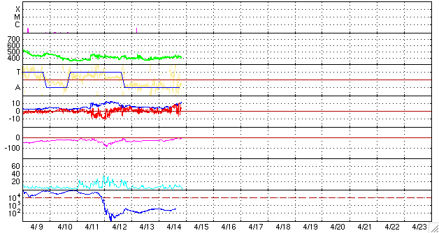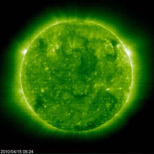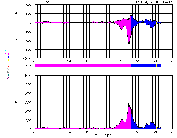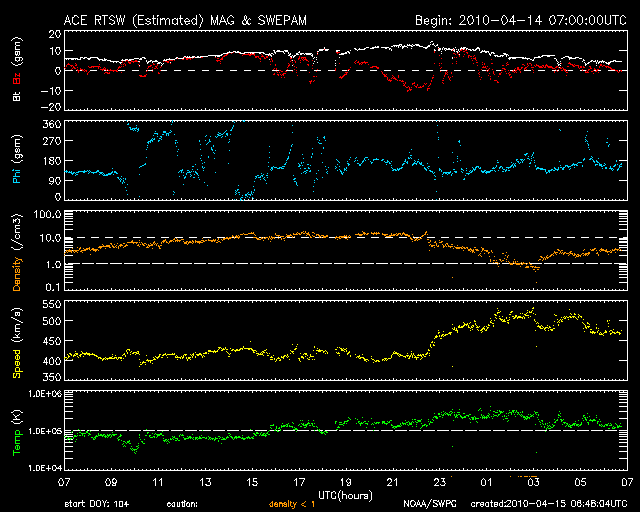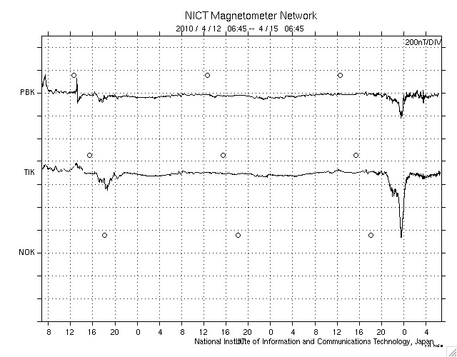 2010/ 4/15 15:49 更新 500km/秒の高速太陽風がやって来ました。激しいオーロラ活動が1回発生しています。 担当 篠原 今日は更新が遅くなり、申し訳ありませんでした。 電波が届かない地域に入っていました。 今日は、早朝に太陽風速度の上昇が見られ、コロナホールの影響がやって来たようです。 ACEの観測によると、昨夜から太陽風の磁場強度がゆっくりと強まり、 15日6時(世界時14日21時)くらいに10nTに達しました。 その1時間半後に、今度は速度が上昇を始め、400km/秒から500km/秒へ上がっています。 速度が上がり始めた頃から、磁場強度は低下に転じ、現在は4nTほどになっているようです。 一方、太陽風の速度は、500km/秒前後を推移しましたが、 現在はやや下がって、470km/秒ほどです。 速度が上昇する直前に、 2時間ほど太陽風磁場が-10nT近くまで達する強い南向きになっています。 この影響で、AE指数1500nTに達する、激しいオーロラ活動が発生しました。 磁気圏の活動としては、これ一発という感じで、 その後は、比較的穏やかに推移しているようです。 太陽風の磁場強度は既に弱まりつつあることから、 現在の高速風はそれほど長く続かないだろうと思われます。 明日くらいには低下が見えてくるのではないでしょうか。 太陽では、1062黒点群は見えなくなり、無黒点になったようです。 X線も全く変化していません。 SOHO EIT195による太陽コロナ。15日15時半(世界時15日6時半)。 (c) SOHO (ESA & NASA) ![]() SOHOによる太陽可視光写真。無黒点です。 (c) SOHO (ESA & NASA) ![]() ACEが観測した太陽風の磁場(1番上の枠、白線は全体の強度、赤線は南北成分) および、太陽風の密度(3番目の橙線)、速度(4番目の黄線) (c) NOAA/SWPC ![]() リアルタイムAE指数 下段のAEグラフの値が高くなると、オーロラ活動が活発化しています。 (c) 京都大学, NICT ![]() シベリアで観測された3日間の磁場データ 右側の3分の1が、昨日のデータになります。グラフが上がったり下がったりすると、オーロラ活動が活発化しています。 (c) NICT ![]() 27日の太陽周期に合わせたデータプロット 太陽が同じ面を地球に向けていた27日前の変化から、今後を予想することができます。 (c) NICT